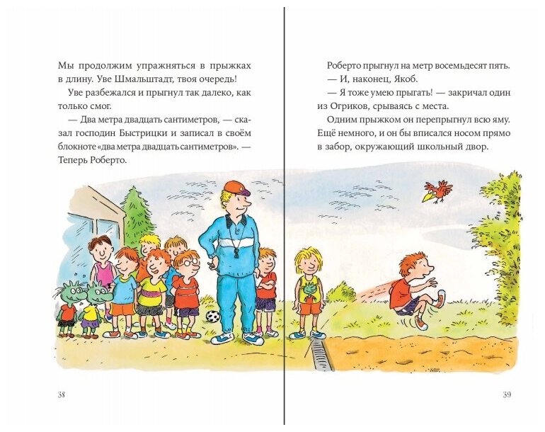 Огрики, конечно, понятия не имели, что такое школа. Они с любопытством прокрались вслед за детьми в здание, прошли через широкую дверь мимо автоматов с какао, потом вдоль стены, на которой висели картинки 2 В класса.