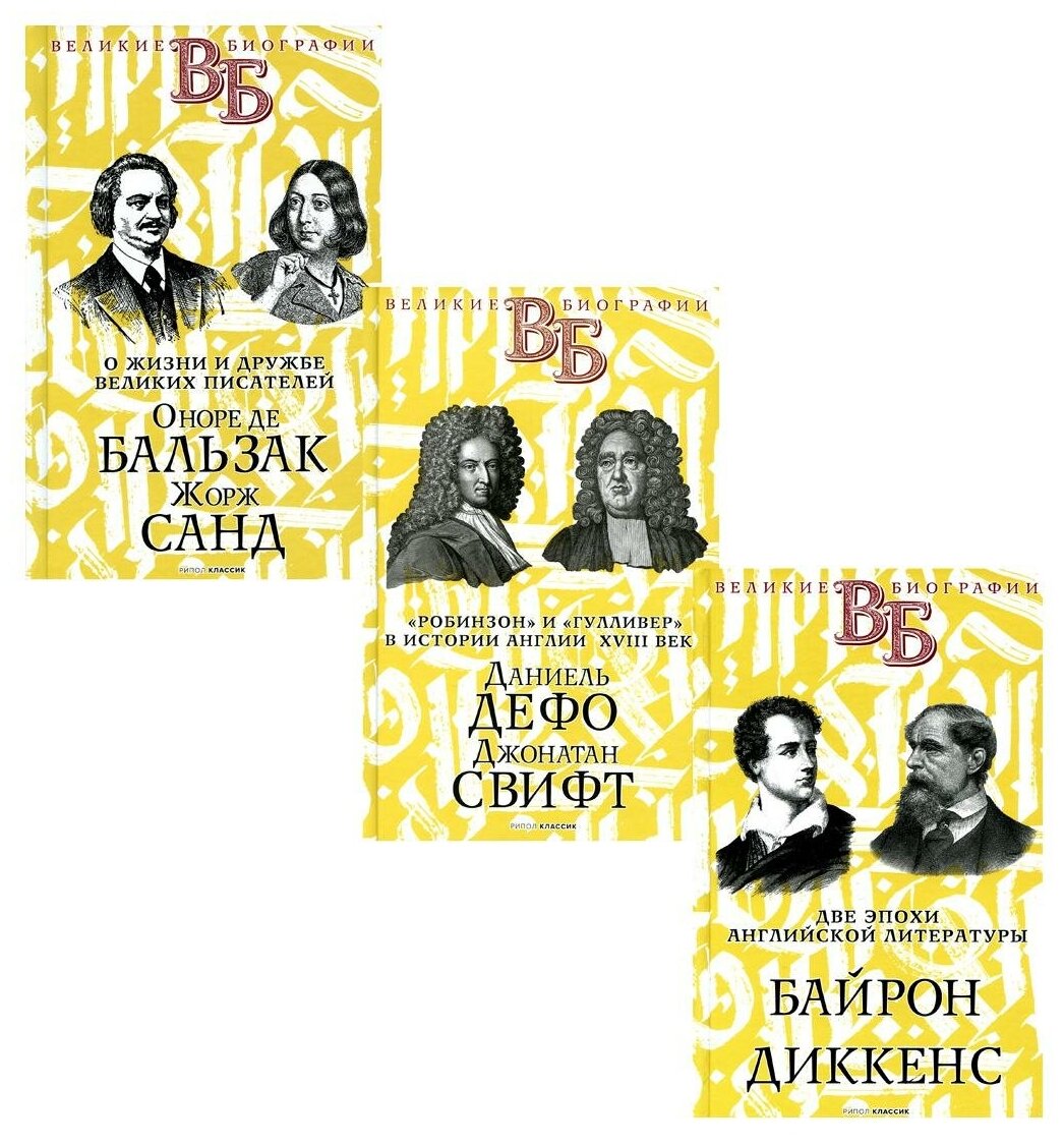 В комплект "Жизнь великих. Гении эпохи" вошли книги: "Байрон. Диккенс. Две эпохи английской литературы" Байрон. Джордж Гордон Байрон происходил из знатного рода, фамильным девизом которого был "crede Byron" ("верь Байрону"). Однако относительно биографии поэта девиз не применим - Байрон всячески мистифицировал свою жизнь: утверждали, что он писал анонимные письма в газеты, где сообщал о себе самые отчаянные вещи. Гете некоторое время был убежден, что Байрон участвовал в тайном убийстве. Величайший гений и мятежный лорд, чья жизнь не менее увлекательная, чем его произведения. Диккенс. Чарльз превзошел Байрона в популярности и в тиражах так же естественно, как и сменилась эпоха романтизма реализмом. Непревзойденный юмор, живые, скромные персонажи, гуманизм и милосердие его прозы оказались востребованы в XIX веке как в Англии, так и во всем мире. Становление писателя происходило через счастливое, но бедное детство, долги, путешествия, семью, литературный труд и прижизненную славу. "Даниель Дефо. Джонатан Свифт. "Робинзон" и "Гулливер" в истории Англии XVIII века" Даниель Дефо. Для нас Дефо и Свифт навсегда останутся чудесными писателями, книгами которых мы зачитывались с детства. Однако жизнь автора "Робинзона Крузо" оказывается плотно связана с политического и религиозной жизнью Англии: он был журналистом, писал памфлеты. Оптимизм не спас писателя от тюрьмы, штрафов, позорного столба и смерти в нищете. Джонатан Свифт. Свифта принято представлять как пессимиста, мизантропа, человека, углубленного в интеллектуальные изыскания, профессора. Писатель также не был лишен полемического дара, распространял памфлеты о ирландской национальной независимости и англиканской церкви. Негодование и свобода - вот как можно описать идеалы автора того самого "Гулливера". "Оноре де Бальзак. Жорж Санд. О жизни и дружбе французских писателей" Оноре де Бальзак. Отец натуралистического, реалистического романа - так описывал свой метод: "Я не сочиняю человеческую природу, я ее наблюдаю в ее прошлом и настоящем. Я изображаю людей не такими, какими они должны быть, а такими, какими они на самом деле бывают". Автора считали безнравственным, осуждали за такого рода искренность в изображении французского общества Второй республики. В защиту выступали многие его современники, в том числе романистка Жорж Санд, с которой он дружил на протяжении всей жизни. Жорж Санд. Ей принадлежит одно из почетнейших мест среди представителей французского романтизма. Ее назвали адвокатом всех женщин, так как она боролась с угнетением и предрассудками за истину. Санд наблюдала рассвет и упадок романтизма в литературе. Она признавала достоинства реализма как направления, поддерживая своего дорогого друга, Оноре де Бальзака.