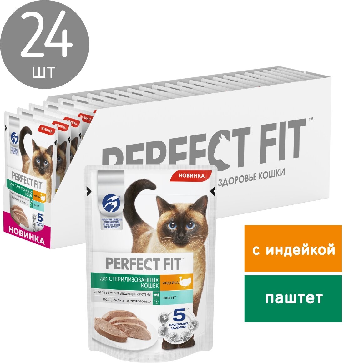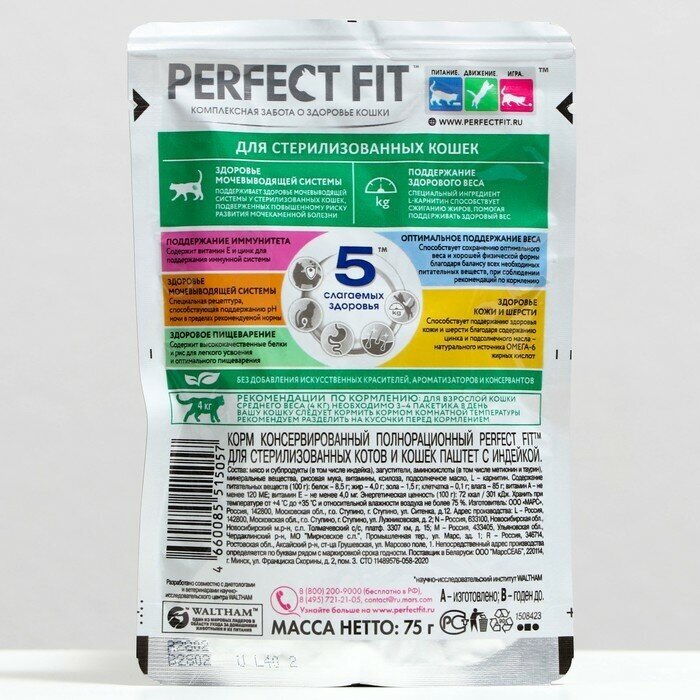 Влажный корм в паучах PERFECT FIT паштет с индейкой для стерилизованных кошек разработан по специальной рецептуре для контроля здоровья кошек, прошедших стерилизацию. Здоровье мочевыводящей системы Поддерживает здоровье мочевыводящей системы у стерилизованных кошек, подверженных повышенному риску развития мочекаменной болезни Поддержание здорового веса Специальный ингредиент L-карнитин способствует сжиганию жиров, помогая поддерживать здоровый весСостав:Мясо и субпродукты (в том числе индейка), загустители, аминокислоты (в том числе метионин и таурин), минеральные вещества, рисовая мука, витамины, ксилоза, подсолнечное масло, L-карнитин.