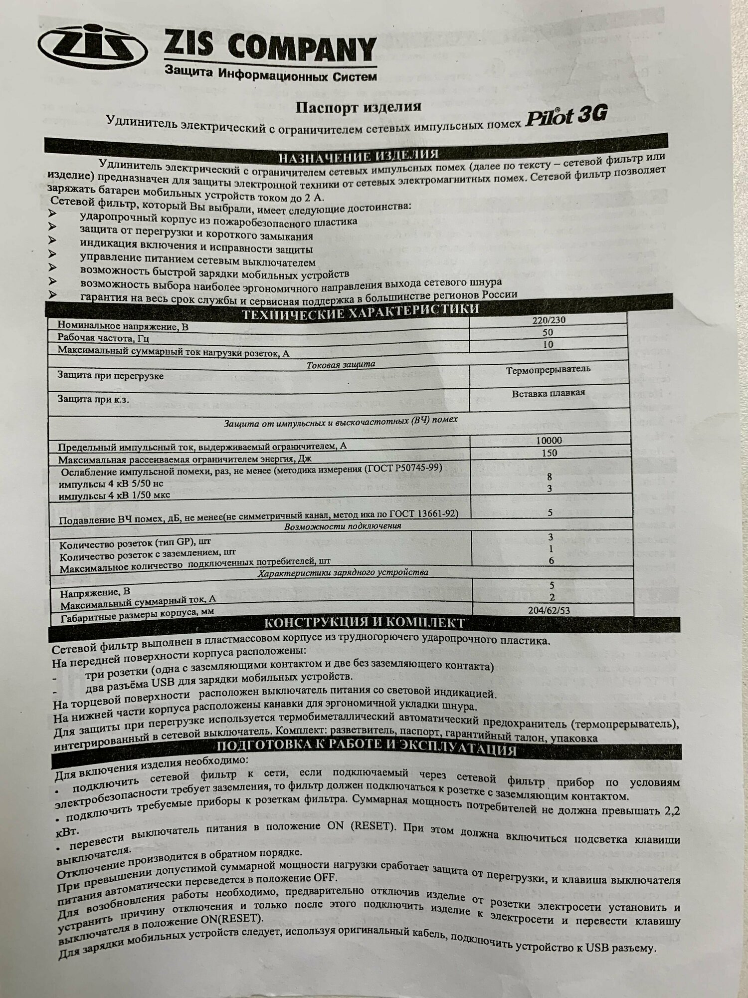 | Дополнительно * | Схема защиты сетевого фильтра Pilot 3G включает в себя:, , – варисторный ограничитель для защиты от импульсных скачков напряжения и грозовых разрядов;, , – термопредохранитель для защиты от перегрева внутри корпуса;, , – плавкий предохранитель для защиты от короткого замыкания;, , – автоматический термобиметаллический предохранитель для защиты от перегрузки., , Корпус изделия выполнен из ударопрочного трудногорючего пластика. , , Розетки формата GP. |