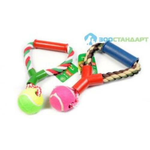 Суперпрочная игрушка для апортировки, отлично подойдёт для активной игры в парке или на даче. Собаки обожают играть с веревочными игрушками, так как их можно грызть, трепать и носить в зубах. Такие игрушки отлично массируют десны и очищают зубной налет во время игры. Веревки сплетены из нетей натурального хлопка, поэтому безопасны для здоровья Вашего питомца. Цвета в ассортименте. Размер d65*250*175мм. Вес 180-190г. Состав: хлопок, резина, пластик