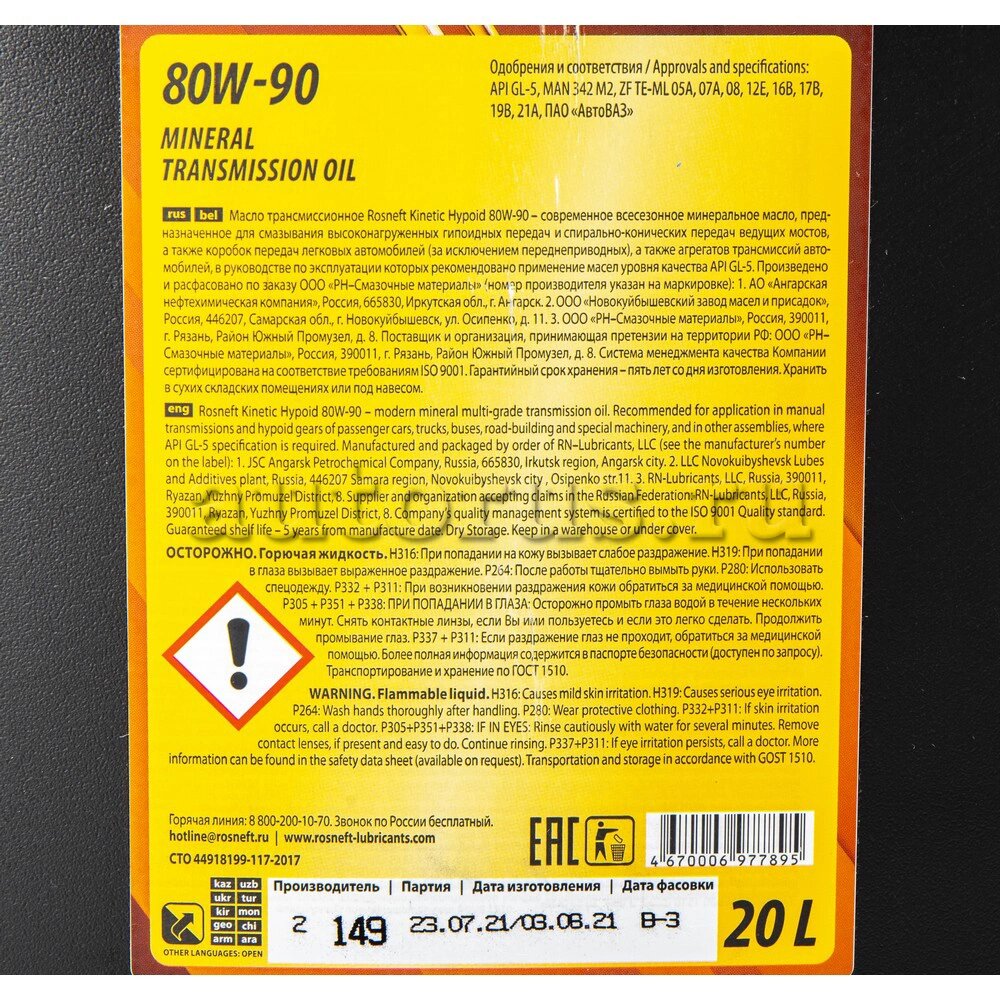 Rosneft Kinetic MT 80W-90 - современное всесезонное трансмиссионное масло на минеральной основе, разработанное для смазывания механических коробок переключения передач. Специальный пакет присадок обеспечивает повышенную стойкость к окислению, высокие противоизносные и противозадирные свойства.