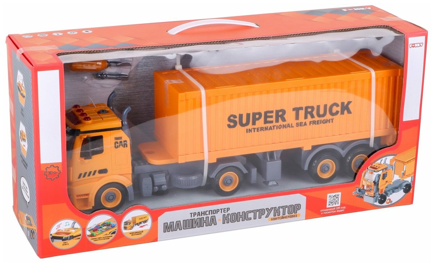 Этот контейнеровоз-конструктор познакомит маленького механика с удивительным миром перевоза грузов. Машину можно разобрать и собрать заново при помощи инструментов в комплекте. Световые и звуковые эффекты сделают игру реалистичной. У машины продуманы все детали: дверцы контейнера открываются, внутри можно положить небольшие предметы в качестве груза для перевозки, фрикционный механизм позволяет машине с легкостью двигаться. Загружайте контейнеровоз и отправляйте в дальнее путешествие!