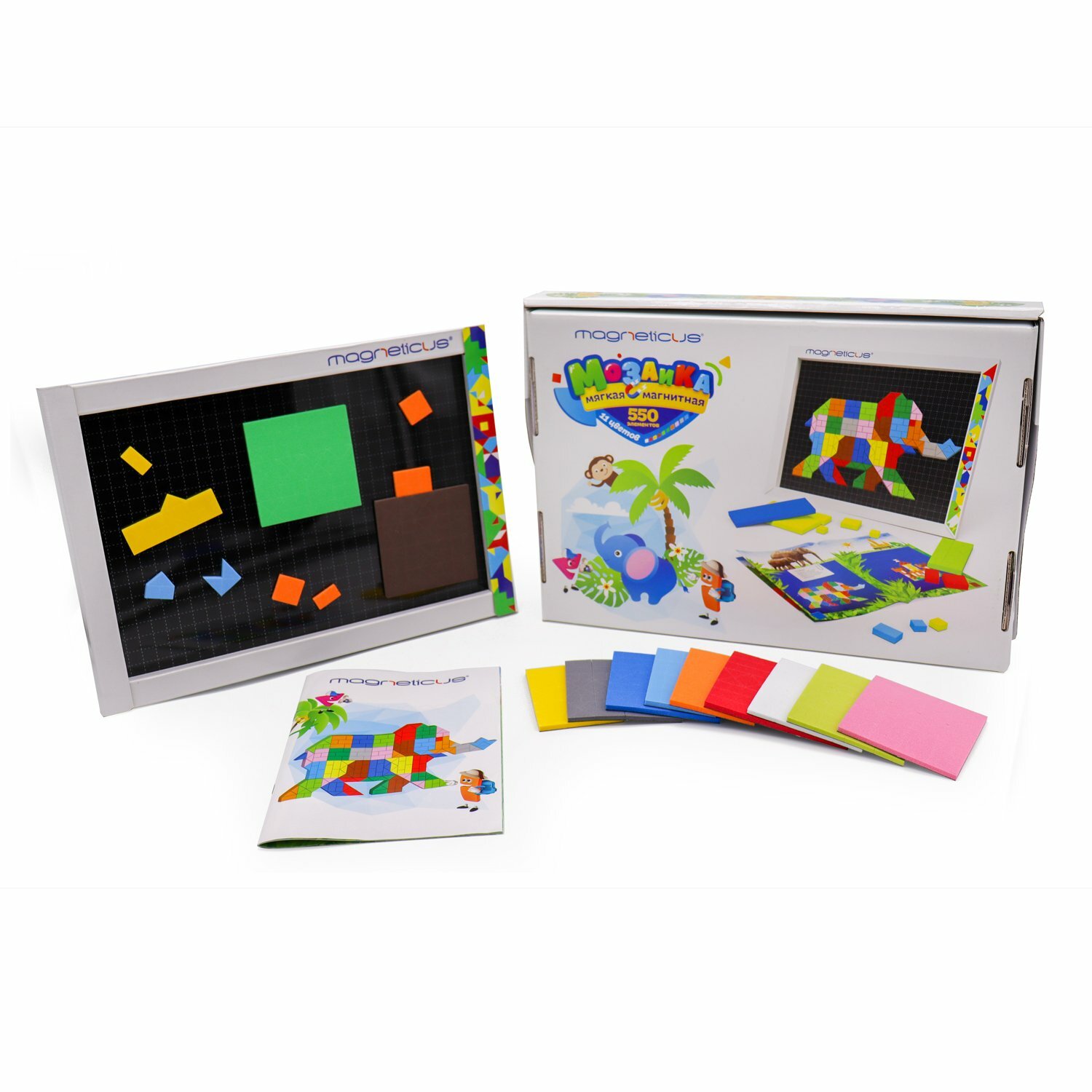 Процесс сборки мозаики способствует развитию воображения, мелкой моторики, внимательности, а также воспитывает в ребенке усидчивость. Мягкая магнитная мозаика Слон, 550 магнитных элемента, 11 цветов, игровое магнитное поле, буклет с примерами, красочная коробка шкатулка для хранения игры, размер 370х265х55 мм.