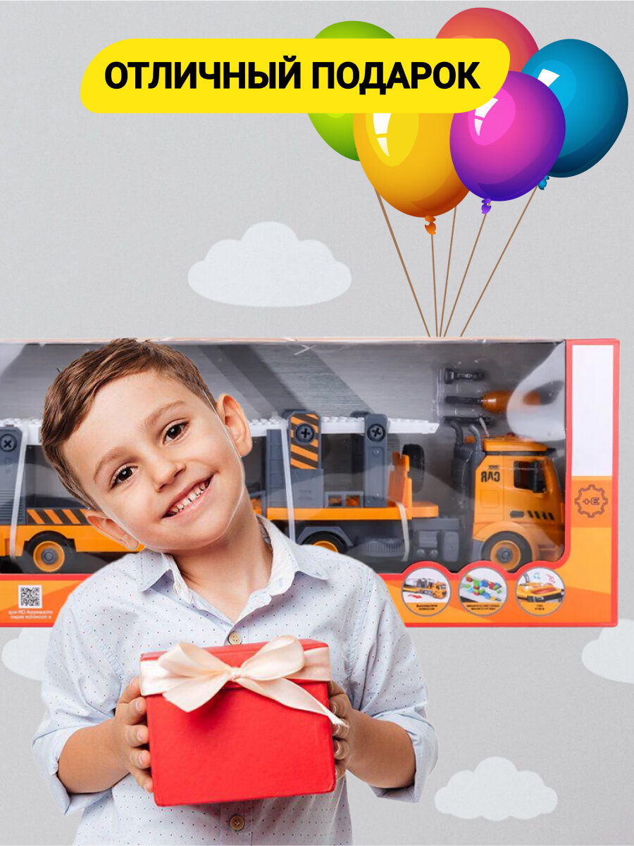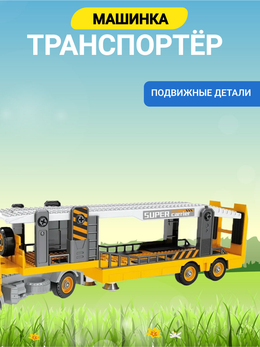 Функциональный транспортер-конструктор станет отличной игрушкой для ребенка. Фрикционный механизм позволяет машине с легкостью двигаться. Световые и звуковые эффекты делают процесс игры реалистичным. Возможность перевозить другие машинки - это главная функция транспортера. Ребенок может использовать любой небольшой транспорт и отправлять его в путешествие при помощи машины-конструктора. Транспортер можно разобрать и собрать заново, что особенно добавляет интереса к игре.