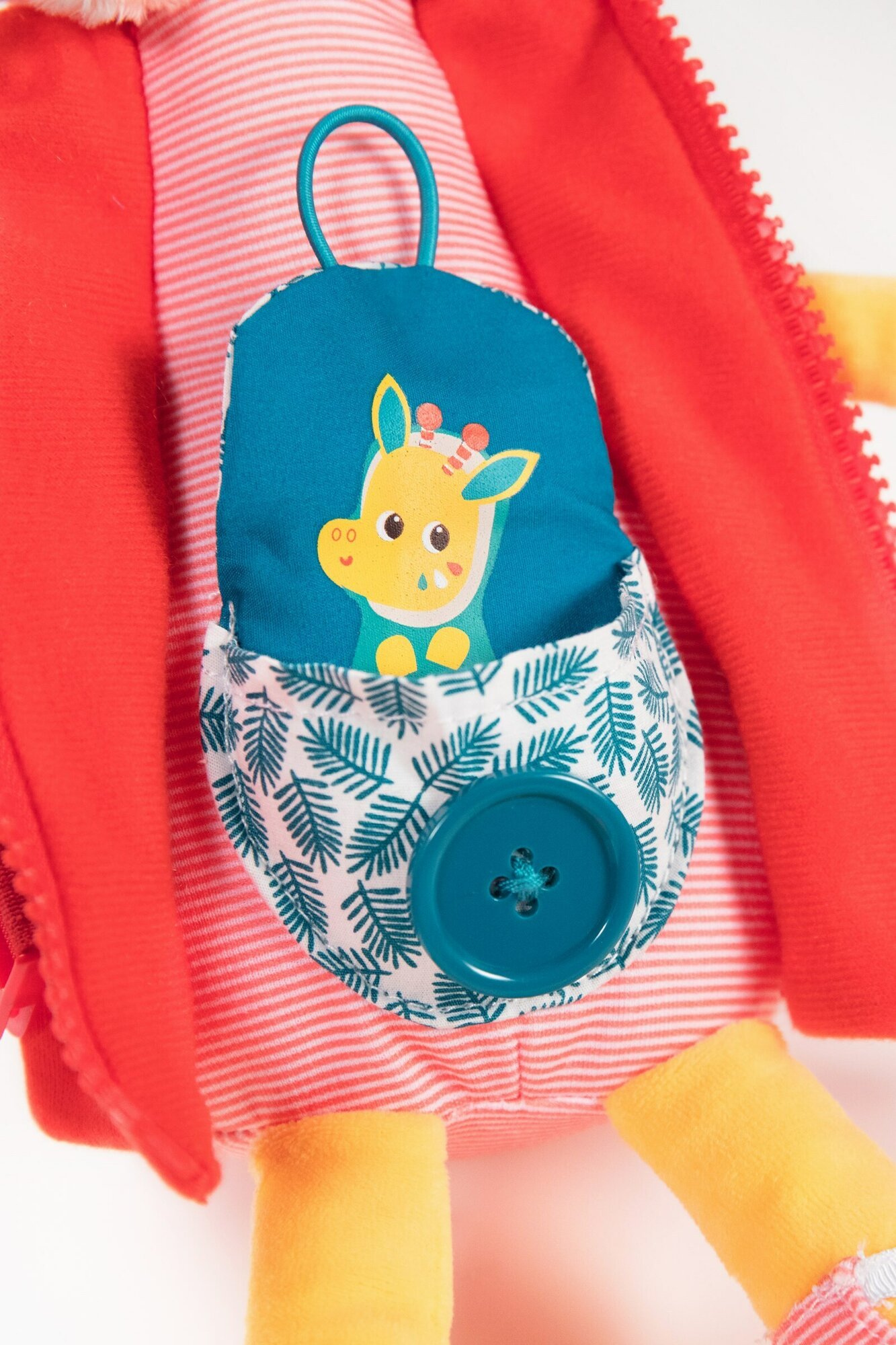 Жирафик Зия очень любит одеваться! Застегните и расстегните курточку, потренируйтесь на поясе с защелкой, а также завяжите ленты на ее гетрах. Расстегните пуговицу на кармашке и найдите спрятавшегося там малыша.