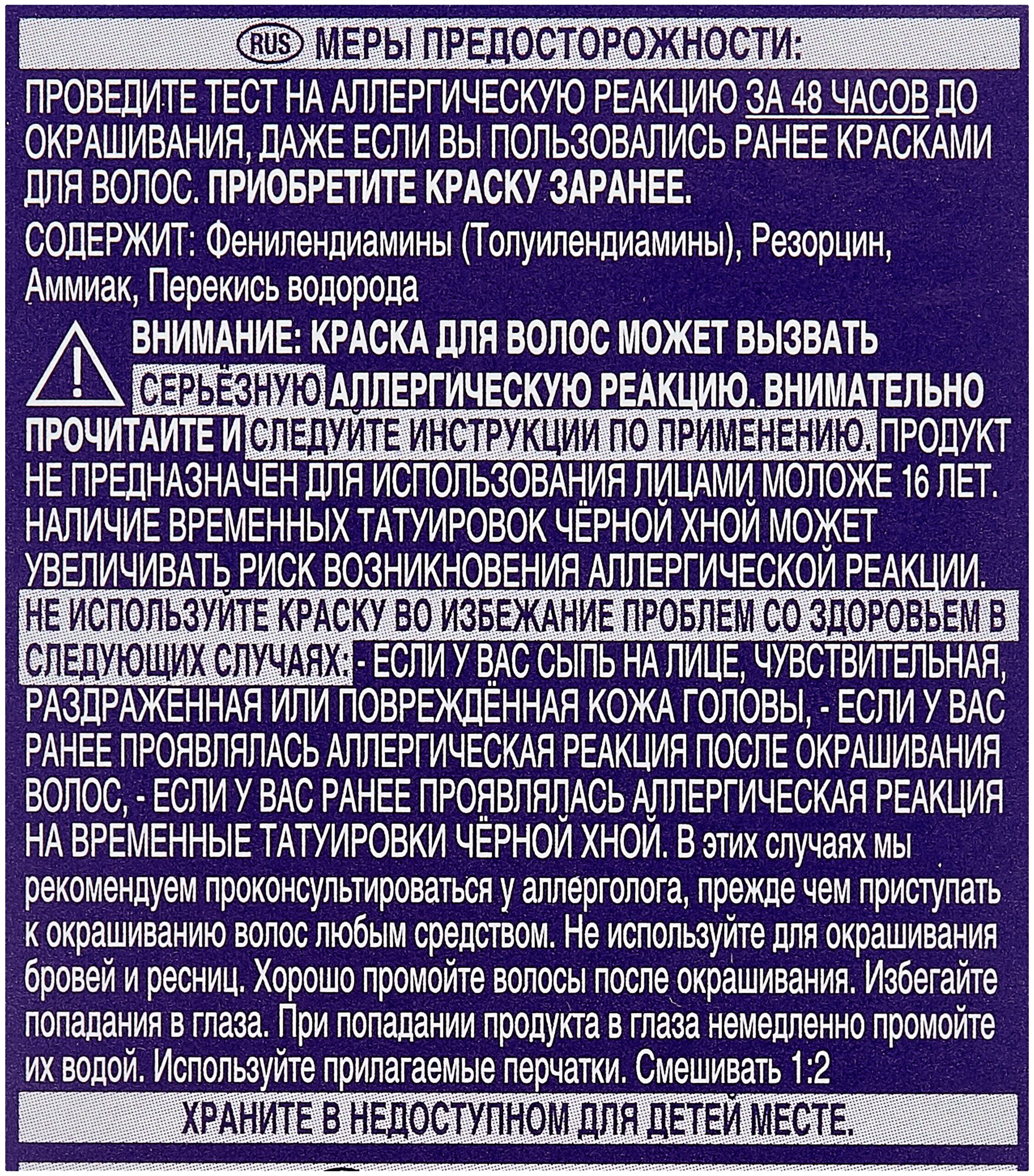 | Состав | aqua, cetearyl alcohol, ammonia, oleamide dea, oleic acid, peg-10 castor oil, oleyl alcohol, pentasodium pentetate, retinyl acetate, hydrolyzed keratin, achillea millefolium extract, chamomilla recutita extract, citrus aurantium amara peel extract, ethanolamine, sodium bisulfite, 2,4-diaminophenoxyethanol, resorcinol, p-phenylenediamine, toluene-2,4- diamine sulfate |