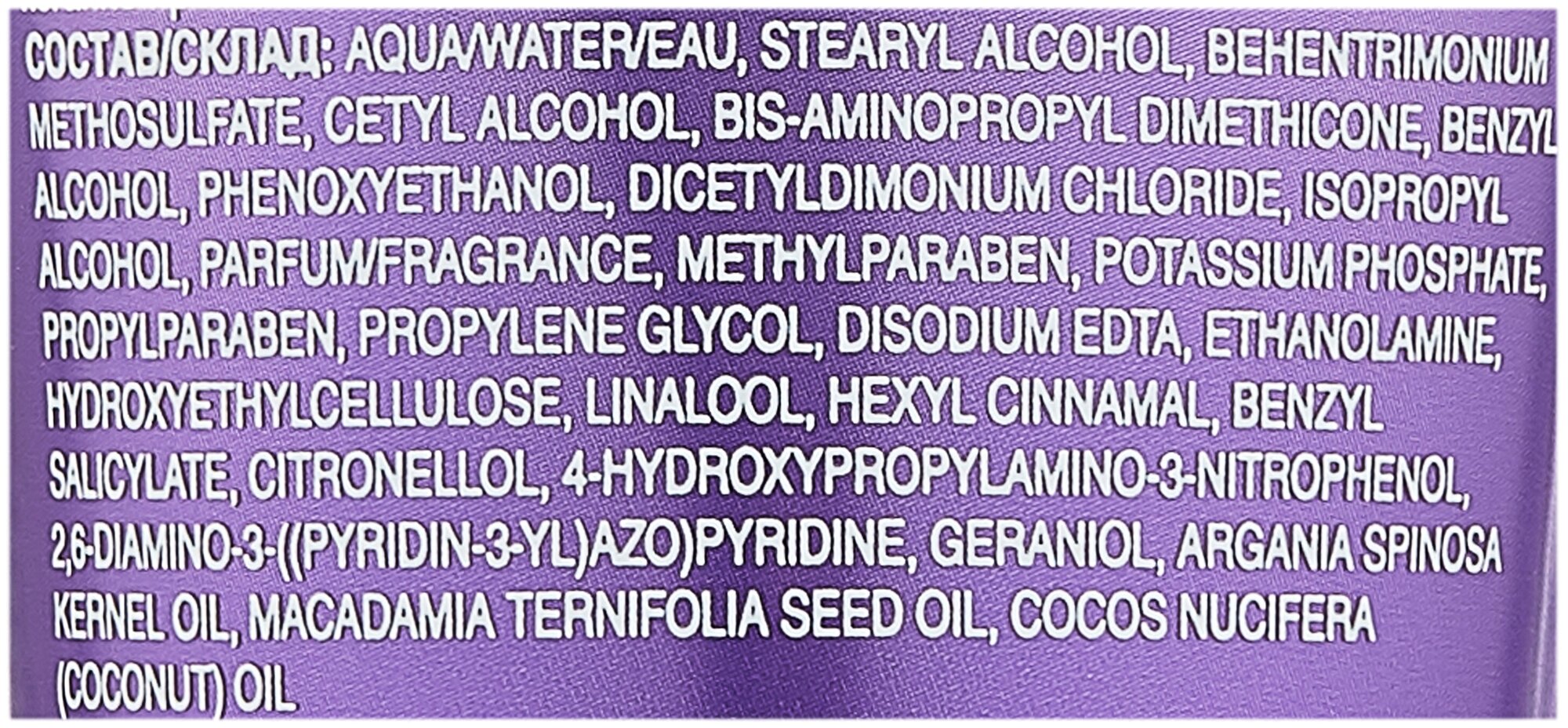 | Состав | Aqua/water/eau, stearyl alcohol, behentrimonium methosulfate, cetyl alcohol, bis-aminopropyl dimethicone, benzyl alcohol, phenoxyethanol, dicetyldimonium chloride, parfum/fragrance, isopropyl alcohol, methylparaben, potassium phosphate, propylparaben, propylene glycol, disodium edta, ethanolamine, hydroxyethycellulose, linaloon, hexyl cinnamal, bezyl salicylate, citronellol, basic brown 17, basic red 76, argania spinosa kernel oil, macadamia ternifolia seed oil, cocs nucifera (cocnut) oil, hc blue no.16. |