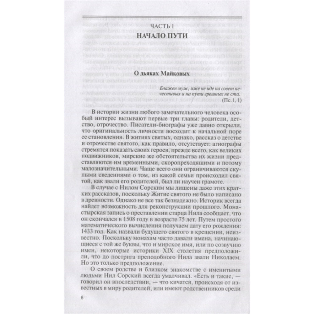 Рассказать о жизни святого - сложная задача. Его жизнь не так событийна, как жизнь государя или полководца. Его внутренний мир - это вообще тайна "за семью печатями". Однако повествуя о жизни преподобного Нила Сорского, видного церковного деятеля Средневековой Руси, автор находит свой ключ к "заветной двери". Этим ключом послужили тексты 24 житий древних святых, которые Нил Сорский отобрал в свои сборники. Они сохранились в автографах преподобного. И чем глубже погружаешься в них, тем больше понимаешь, о чем думал и что чувствовал человек, переписавший их 500 лет назад в небольшом скиту на реке Соре, неподалеку от Кирилло-Белозерского монастыря.