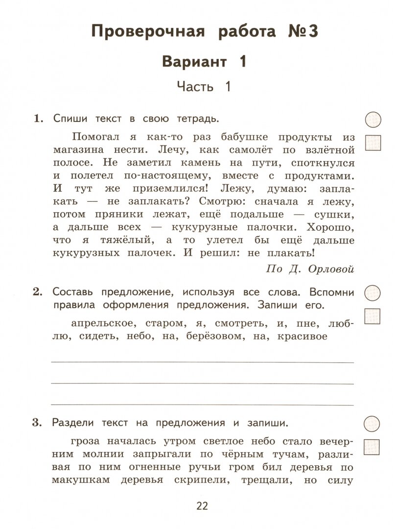 В тетради представлено пять проверочных работ в двух вариантах, равнозначных по степени сложности. Работы № 1-2 могут быть предложены для выполнения учащимся в начале I четверти для определения уровня успешности обучения во 2 классе. Работы № 3-5 целесообразно провести в III-IV четвертях 3 класса. Интересная система развития умений самоконтроля и самооценки способствует успешности в обучении.