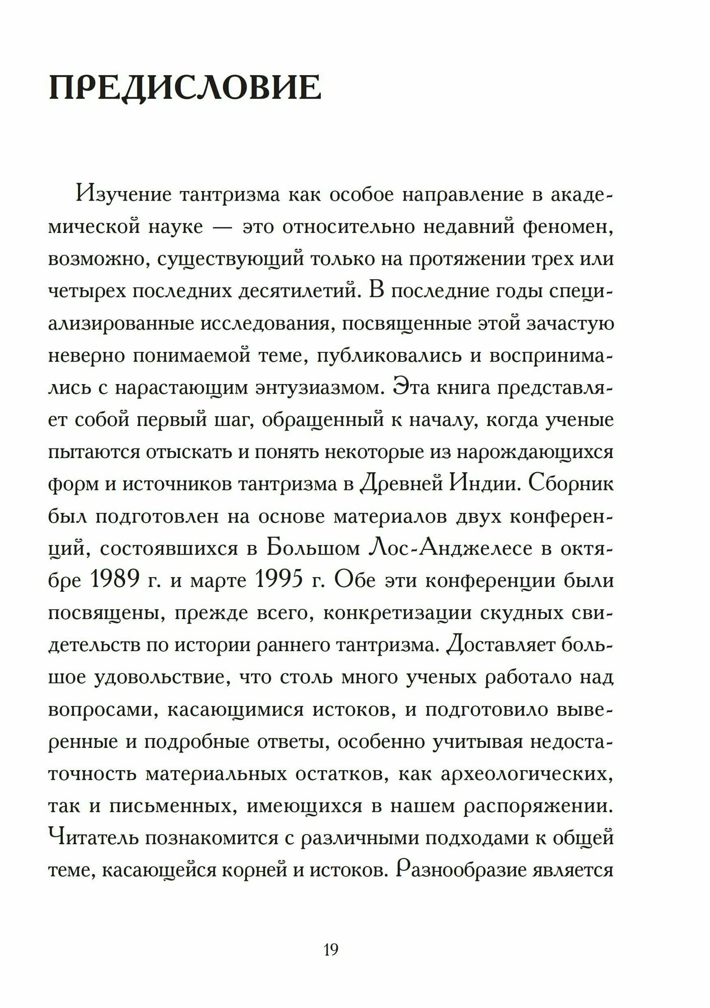 Во многих отношениях Тантра остается terra incognita для отечественных любителей индийской культуры. Серьезных научных работ на русском языке, как созданных русскоязычными индологами, так и переведенных с европейских языков, не так и много, чем и пользуются разного рода проходимцы, организующие с целью коммерческой наживы «семинары» и «ретриты» с придуманными ими самими «духовными практиками». Не могут здесь помочь и многие современные индийские гуру, которые, находясь под влиянием привнесенного британцами пуританизма, толкуют многие реалии Тантры в сугубо метафорическом ключе. Вследствие этого у интересующихся темой Тантры возникают достаточно смутные и искаженные представления об этом феномене. Данная книга, которую я рад представить Вашему вниманию, призвана восполнить этот пробел. Она носит название «Корни Тантры» и представляет собой перевод с английского языка сборника статей, подготовленных ведущими западными и индийскими специалистами (The Roots of Tantra. Eds. K. A. Harper, R. L. Brown. Albany: State University of New York Press, 2002). Как следует из названия, сборник в основном посвящен происхождению и ранней истории тантризма.