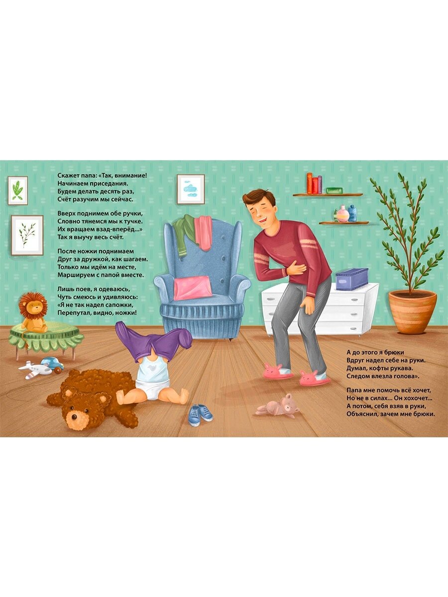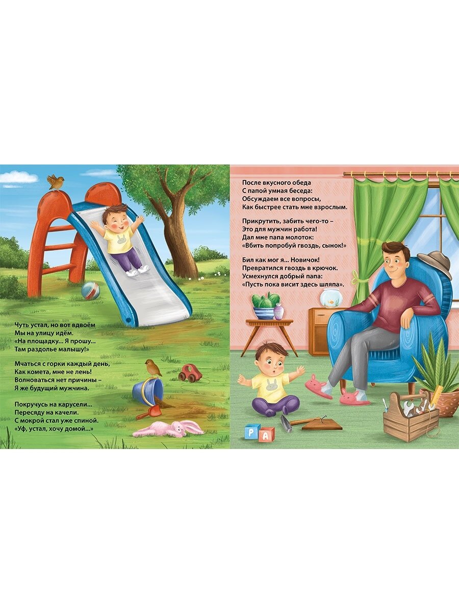 Прекрасная книга, сын с полутора лет её обожает, ведь она про папу, кроме того надёжная, картонная, очень красочная и яркая, со складными задорными стихами. В одном из стихотворений пара катает малыша на спине, как на лошадке - много веселья и озорства! А в другом описан выходной, который сын проводит со своим папой с утра до вечера. Приятные стихи, особенно для мальчиков