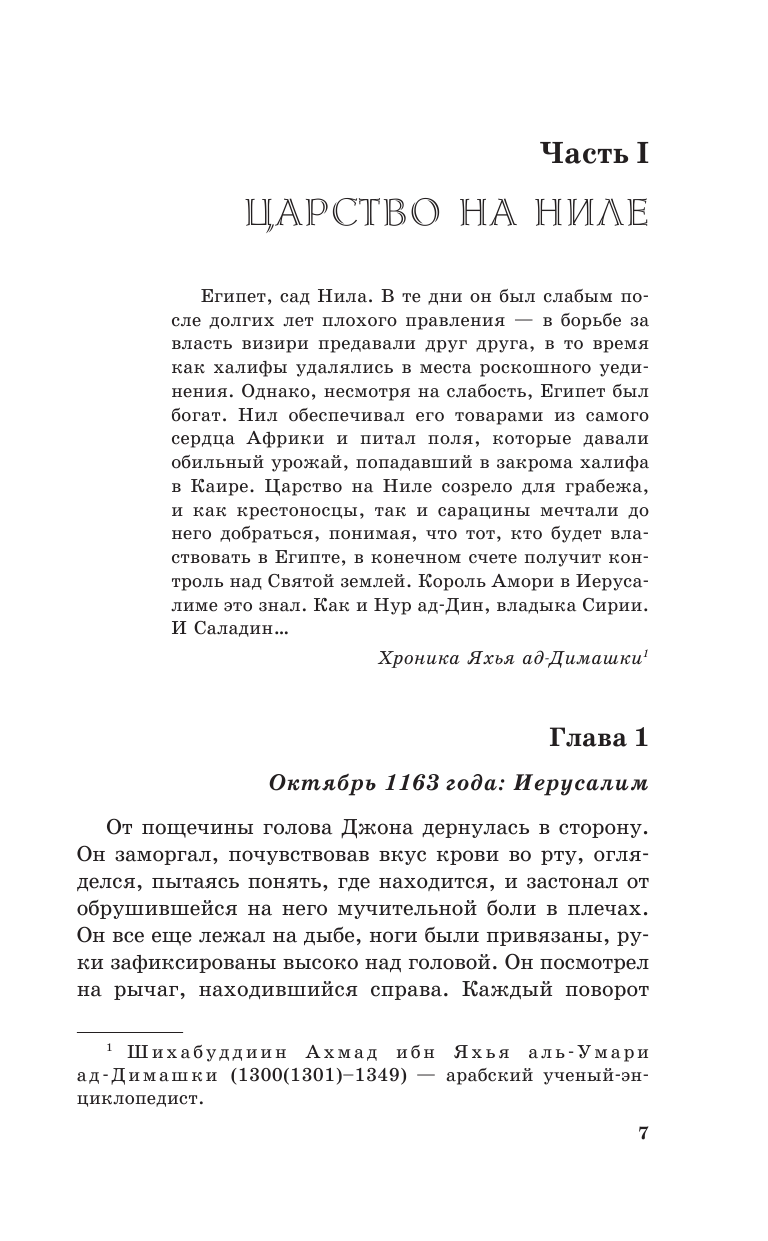 Хорошая книг испорчена ужасным и кошмарным переводом. Все восточные владыки - Египет, Сирия и т.д. именуются без исключения "Царями" или даже "Королями", как во времена древних фараонов. Между тем, книгу переводили аж два переводчика! Неужели у них не возникло мысли, что во времена крестовых походов крестоносцы воевали с "Султанами"!!! Хотя бы в интернет на несколько секунд заглянули. Очень жаль, что такое солидное издательство, как "Эксмо", прибегает к услугам столь невежественных, некомпетентных и ограниченных людей