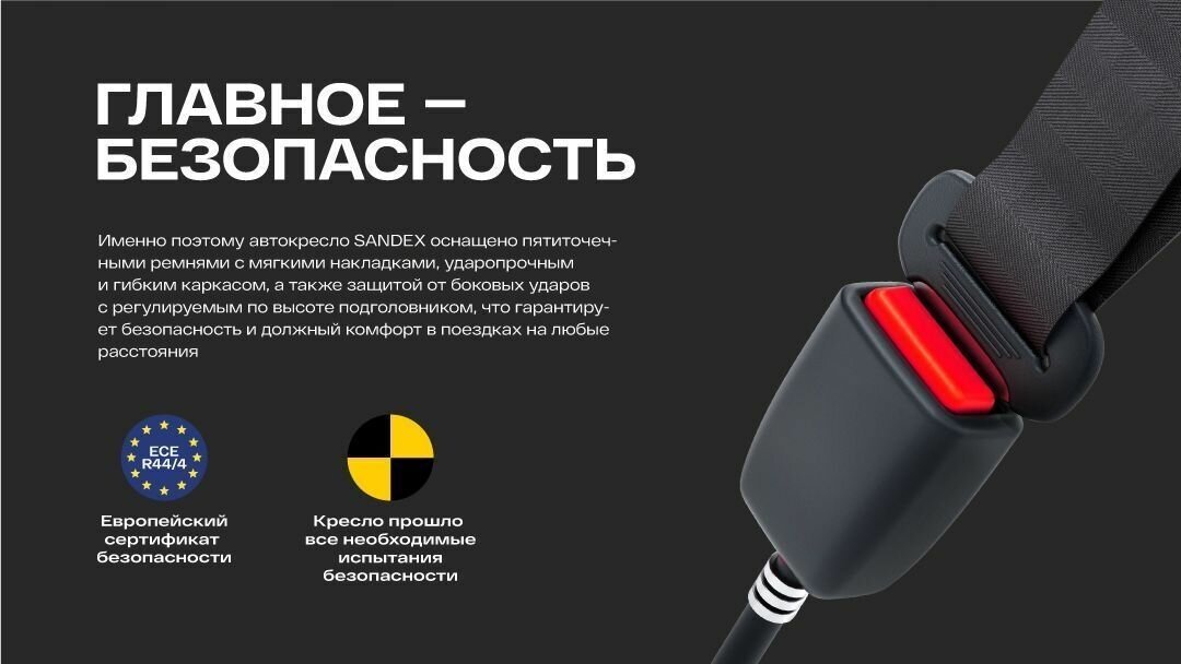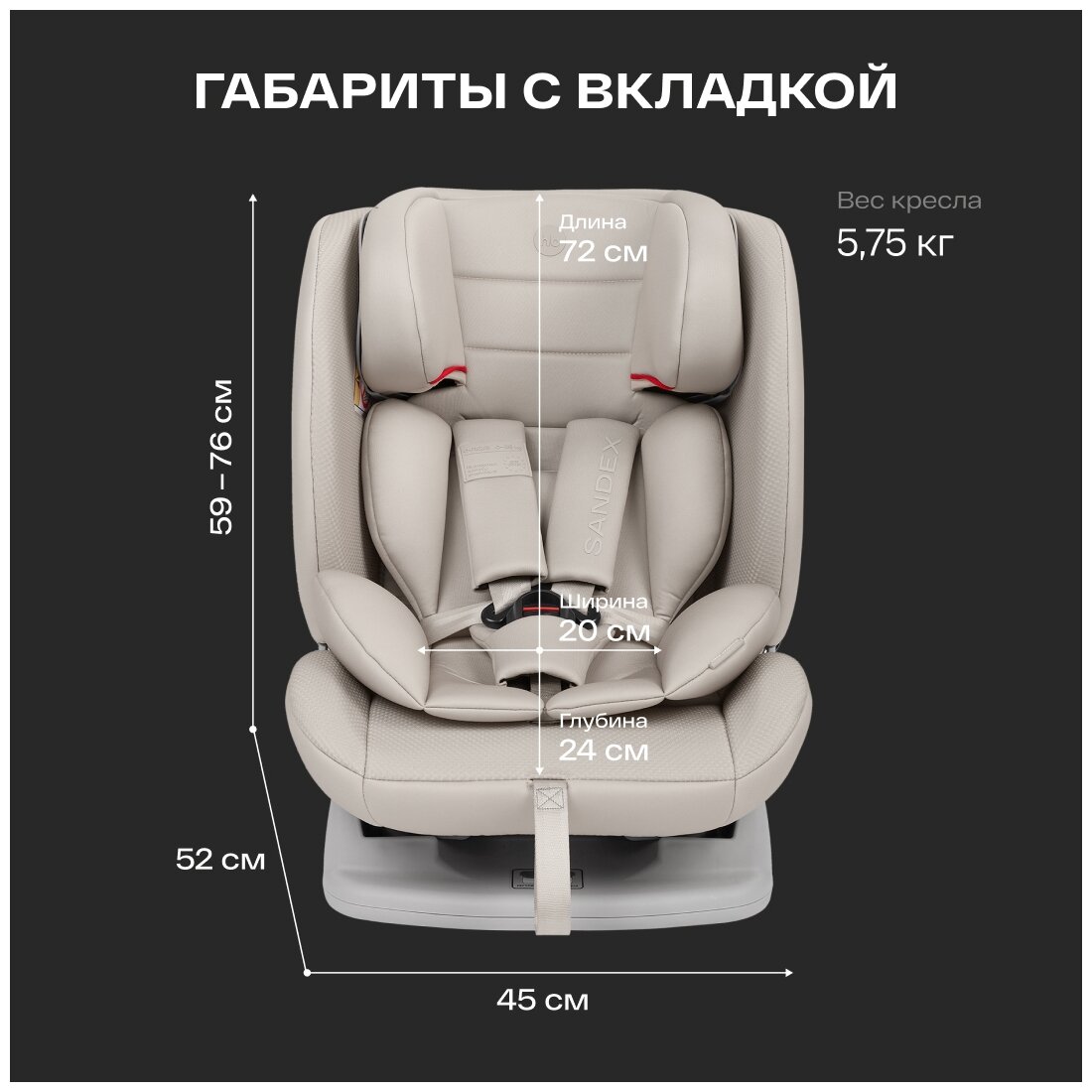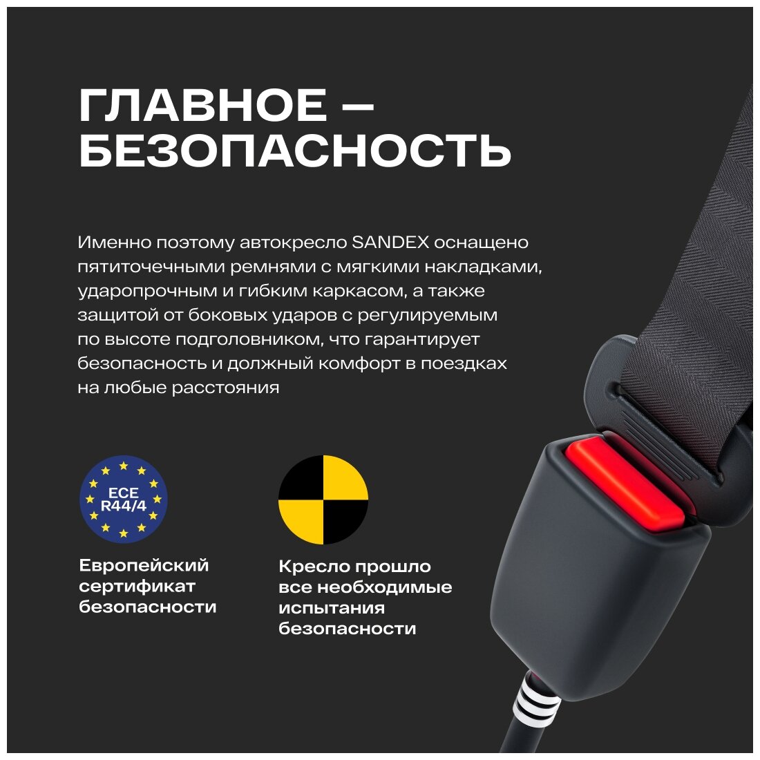 Автокресло SANDEX - это безопасность и комфорт в дороге, легкость установки и использования, обновленный дизайн и практичность. Эта модель прослужит вашему ребенку с самого рождения и до 12 лет, подстраиваясь под растущего малыша и взрослеющего ребенка. Съемная мягкая вкладка в сочетании с мягкими накладками на ремнях безопасности, с мягким настраиваемым по высоте подголовником с 13 положениями по высоте и 4 положения наклона спинки помогут подобрать идеальный вариант для максимального комфорта в пути. Когда малыш подрастет, снимите вкладку и получите большое посадочное место с защитой от боковых ударов. За безопасность отвечают пятиточечные ремни безопасности. Съемный чехол легко снимается и прост в уходе. • Автокресло одобрено для перевозки детей в соответствии с правилом ЕЭК ООН № 44 (ECE R 44). • Возможность установки против хода движения автомобиля для детей весом до 18 кг (группа 0+, I). • Установка по ходу движения автомобиля для детей весом от 9 до 36 кг (группа I, II и III). • Подходит для всех весовых групп • Защита от боковых ударов • 4 положений наклона в зависимости от веса ребенка (назад 110°, 115°, 120°, вперед 145°) • Подголовник регулируется в зависимости от роста ребенка и имеет 13 положений по высоте. • Пятиточечные ремни с мягкими накладками • Вкладыш для детей помладше для дополнительной поддержки. • Полностью съемный чехол для удобства стирки и ухода.