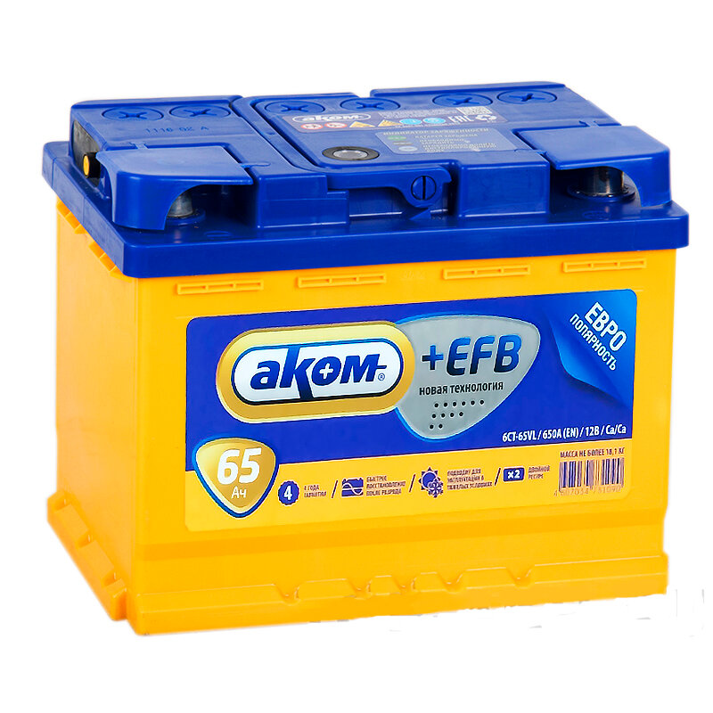 Автомобильный аккумулятор Аком с технологией EFB ёмкостью 65 Ач и высоким пусковым током 670 А обратной полярности (ОП). Кальциевая батарея с улучшенной технологией EFB предназначеная для любых типов автомобилей. Благодаря современным технологиям аккумулятор Akom выхаживает двойной ресурс и имеет устойчивость к циклическим нагрузкам, и другим тяжелым условиям эксплуатации. АКБ способен выдерживать до 250 циклов «заряд-разряд». Аккумулятор обладает уменьшенной потерей емкости после глубоких разрядов и способность к полному восстановлению после больших нагрузок. Аккумулятор практически не требует обслуживания: минимальный расход воды и минимальный объём ухода.