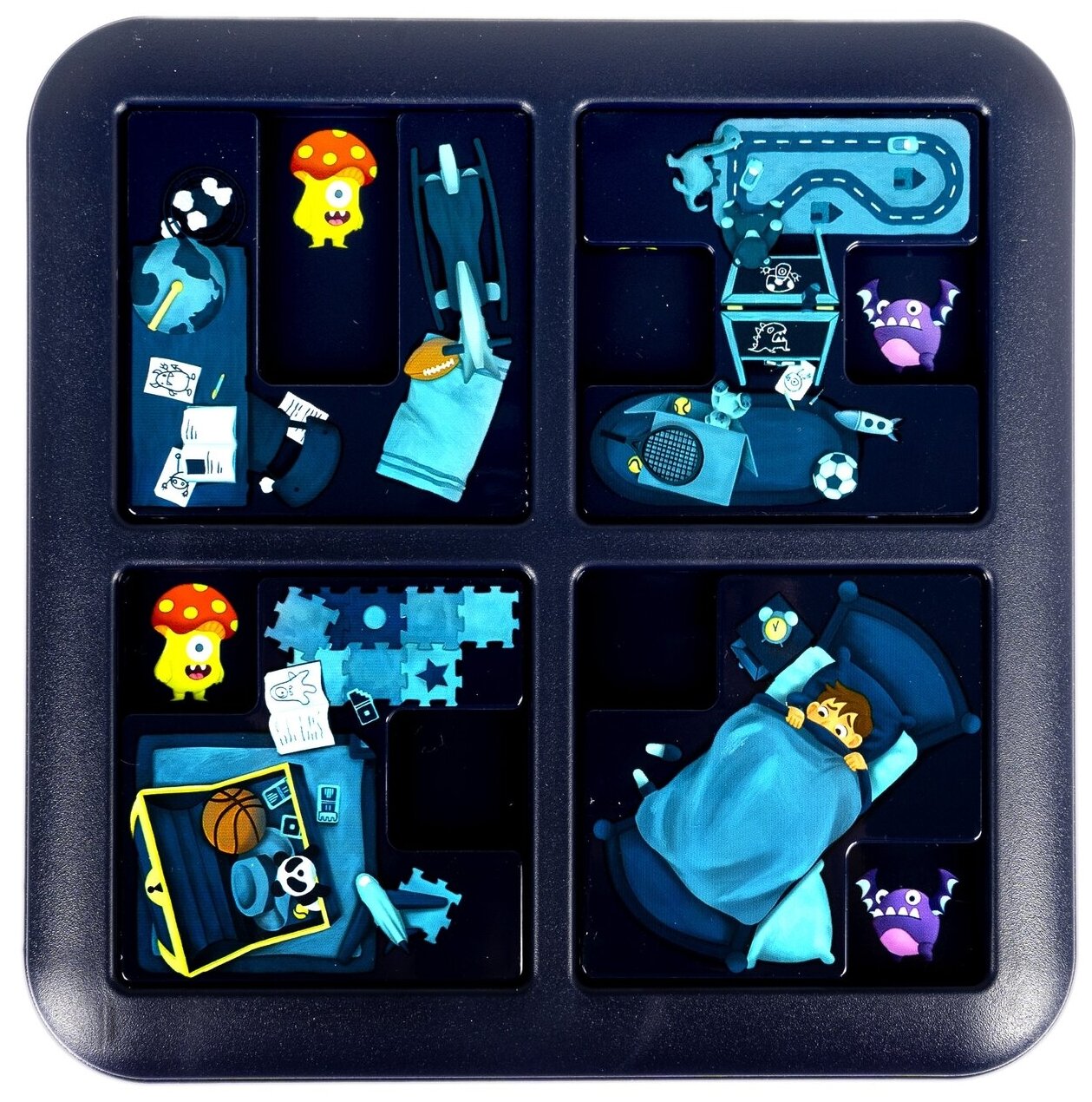 Поместите 4 детали головоломки на игровое поле таким образом, чтобы скрыть всех монстров, кроме тех, которые изображены в задании. В игре 60 заданий разных уровней сложности.