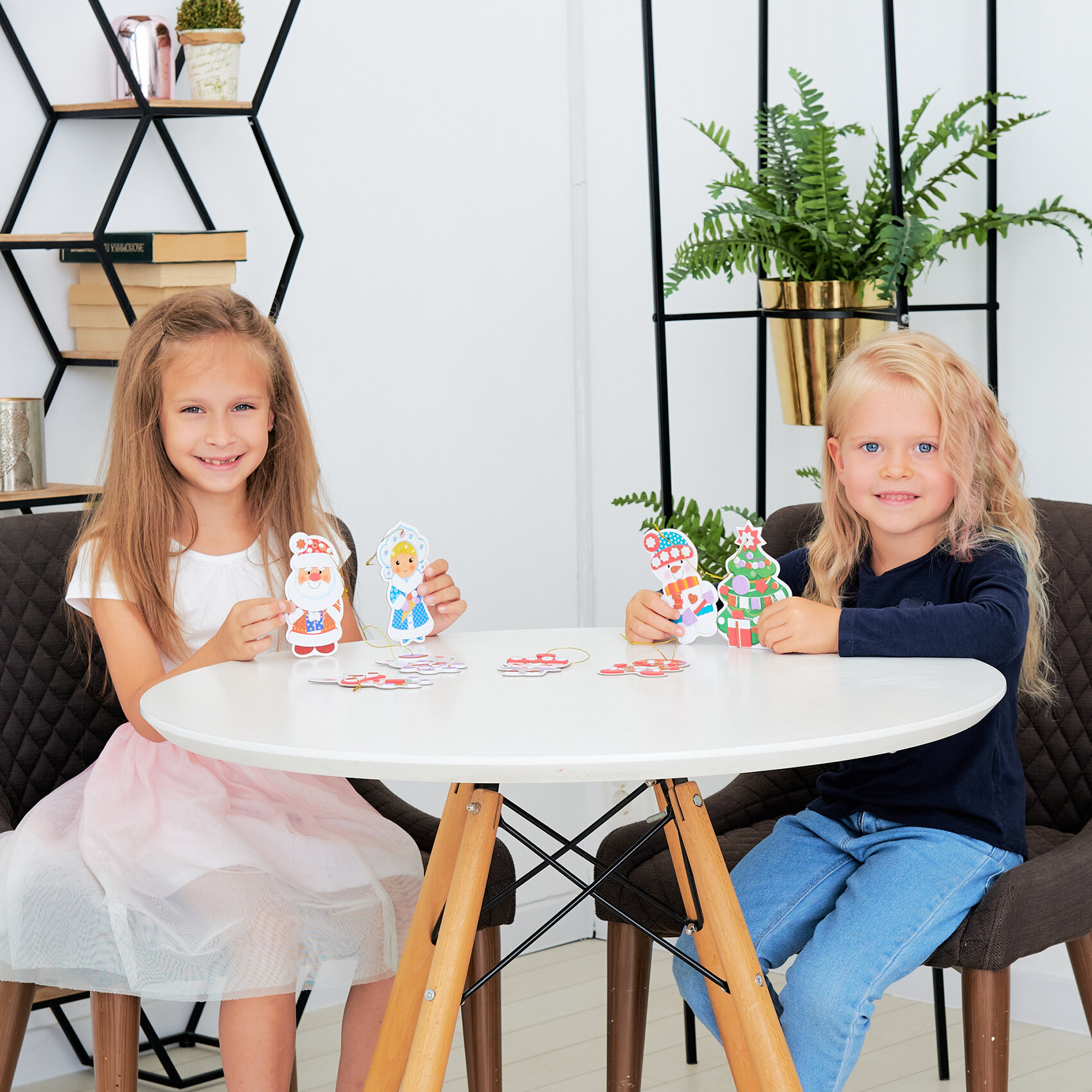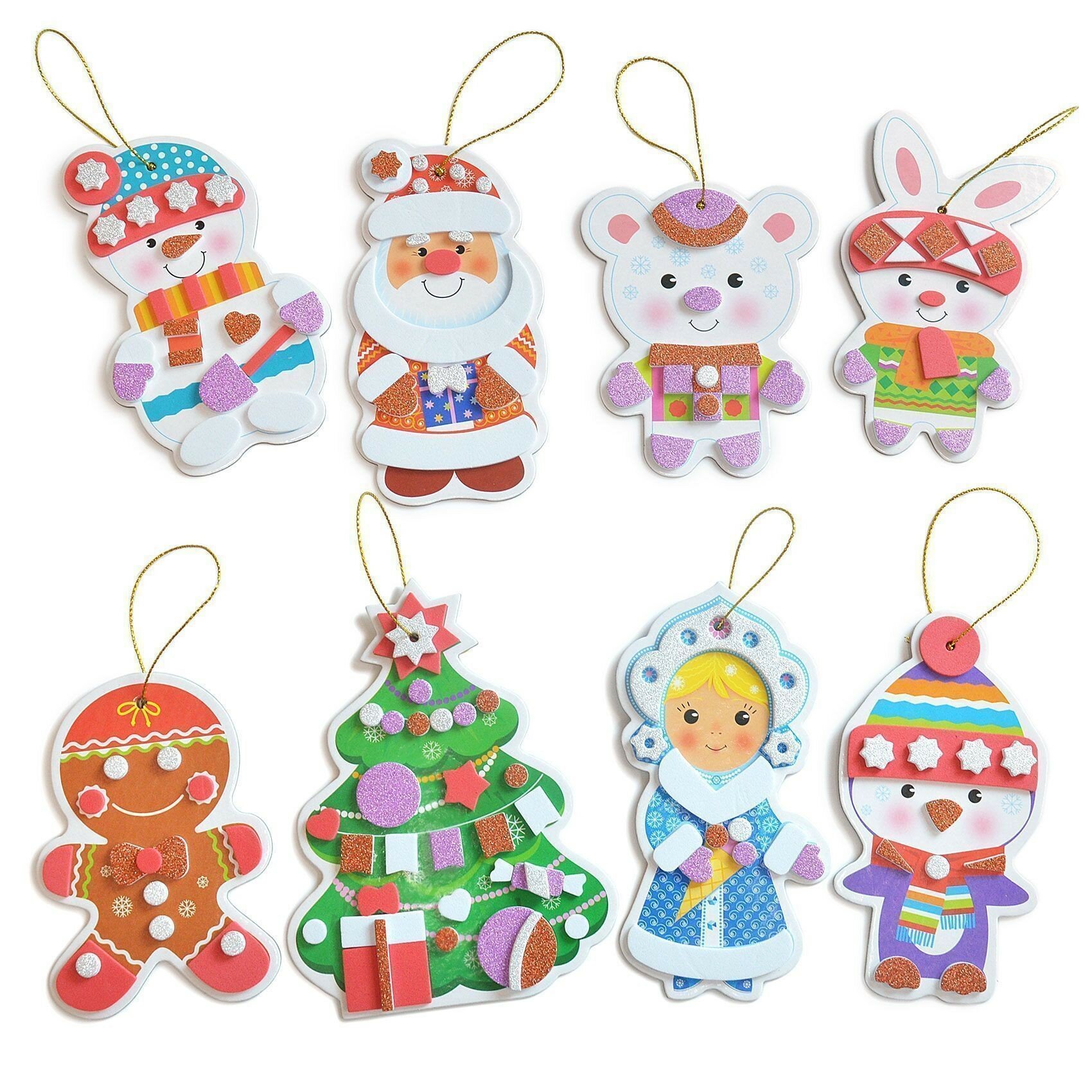 В наборе для детского творчества "Елочные игрушки" 8 цветных двусторонних фигурок из плотного картона. Все детали аппликации уже вырезаны и готовы к работе. Нужно лишь снять с защитного слоя фрагмент и приклеить его в соответствующее место на той или иной фигурке, привязать декоративную нить для подвешивания.