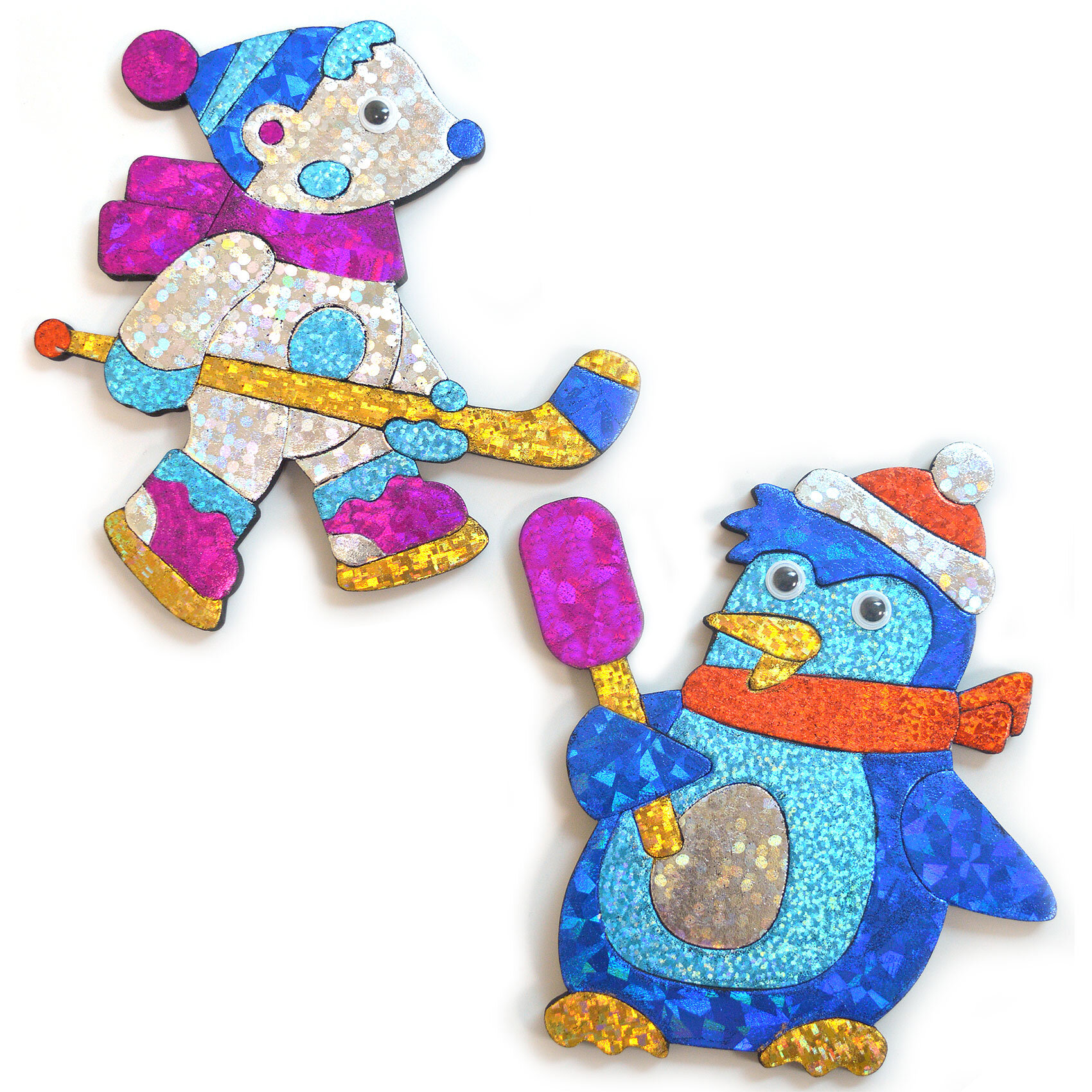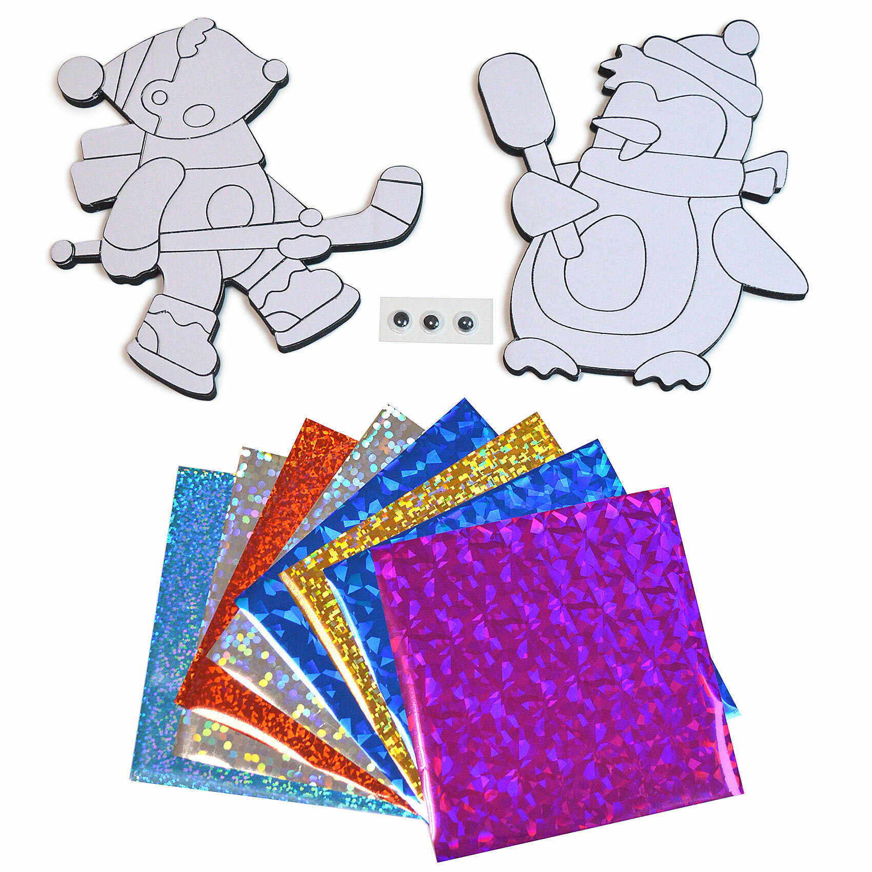 Оригинальная поделка — весёлая игрушка из ЭВА с магнитным винилом, раскрашенная с помощью фольги. Благодаря голографическому эффекту фольги, готовое изделие отличается необыкновенной яркостью и насыщенностью. В наборе 2 поделки. Фигурка получается яркой, красочной и очень эффектной, благодаря переливающейся голографической фольге. Главное, внимательно читайте инструкцию, и у вас всё получится! С обратной стороны фигурки магнитный винил, поэтому её можно легко закрепить на магнитной доске или холодильнике.