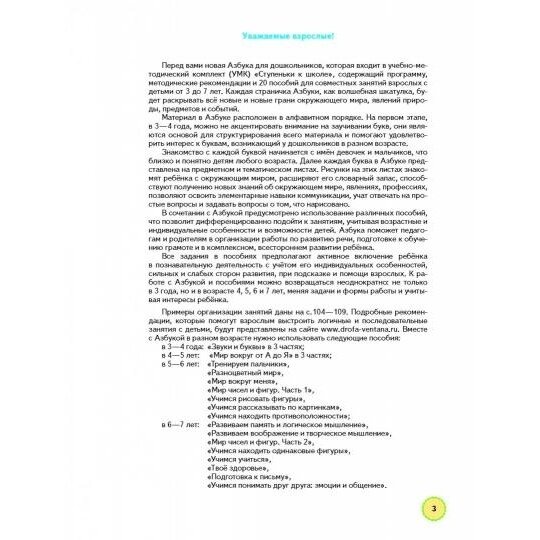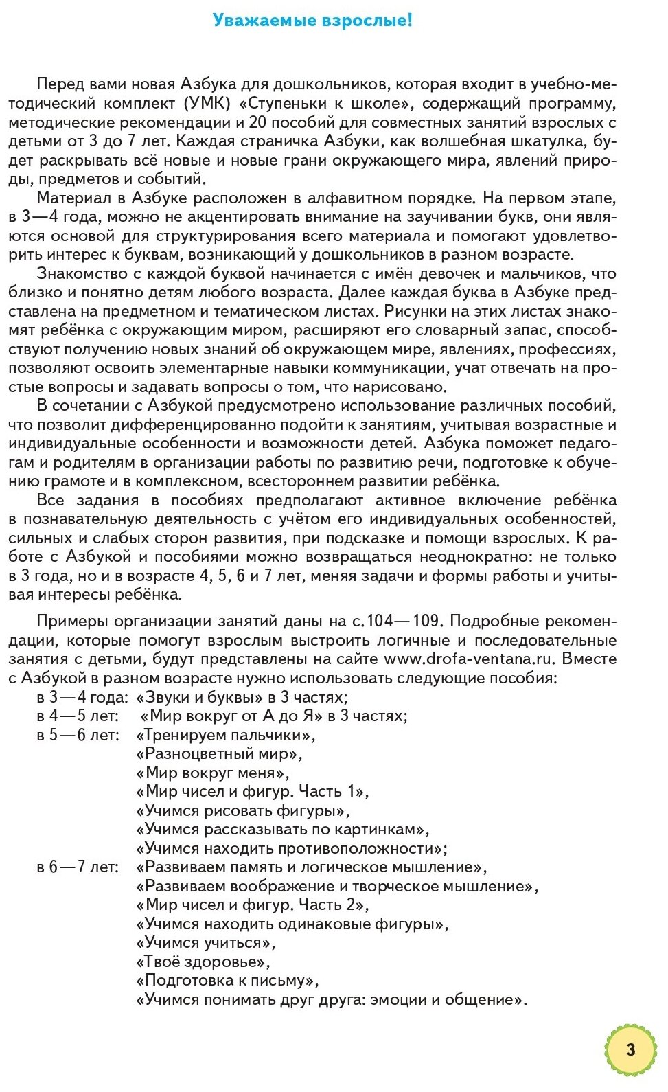 Азбука входит в УМК "Ступеньки к школе" и предназначена для дошкольников от 3 до 7 лет. Она поможет взрослым сделать знакомство с буквами, предметами и явлениями окружающего мира интересным и увлекательным. Включает методические рекомендации и примеры организации занятий с детьми разного возраста. "Ступеньки к школе" - уникальная программа всестороннего развития дошкольников, учитывающая индивидуальные особенности развития детей. Пособие соответствует Федеральному государственному образовательному стандарту дошкольного образования (2014).