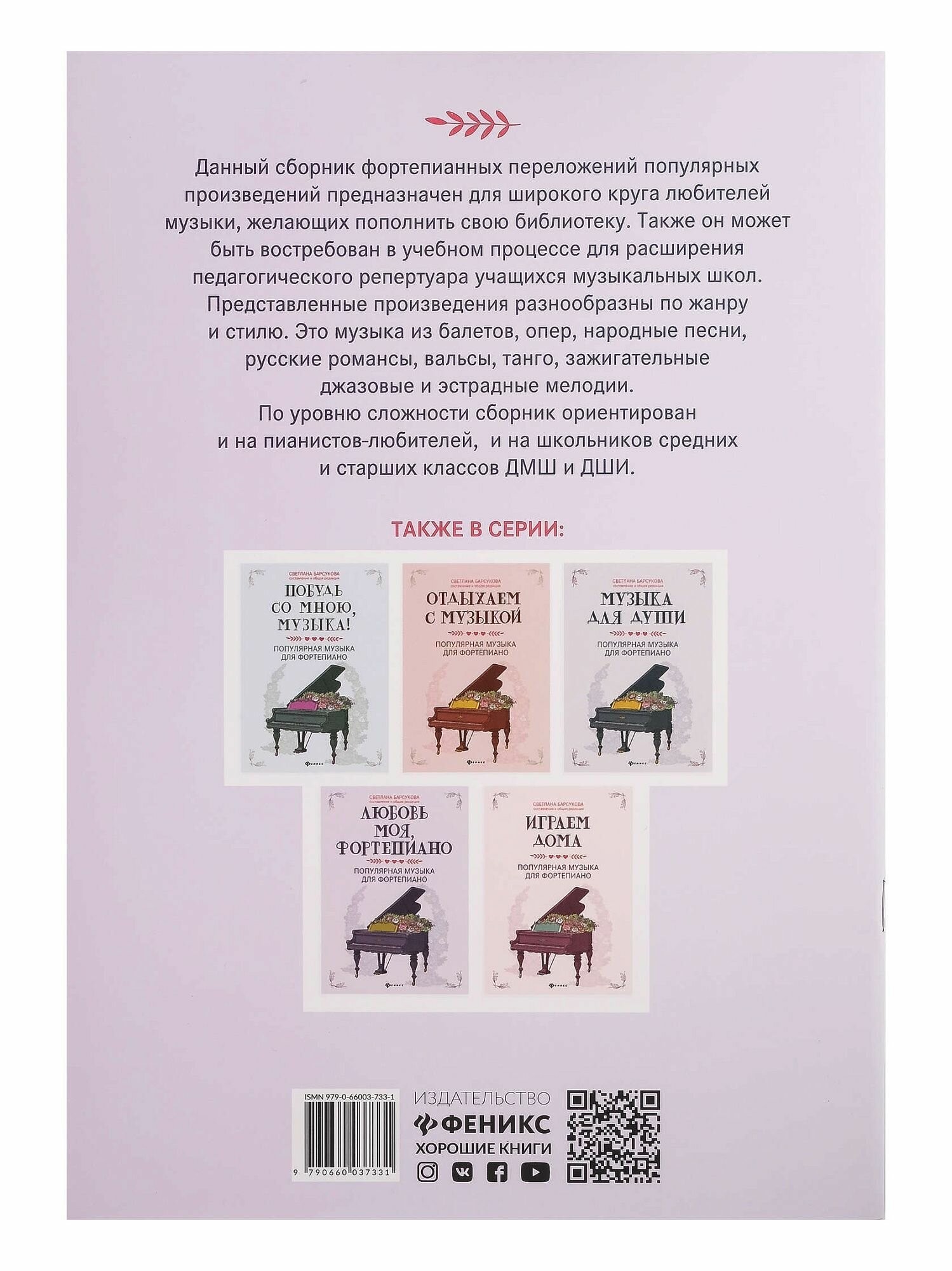 Данный сборник фортепианных переложений популярных произведений предназначен для широкого круга любителей музыки, желающих пополнить свою библиотеку. Также он может быть востребован в учебном процессе для расширения педагогического репертуара учащихся музыкальных школ.