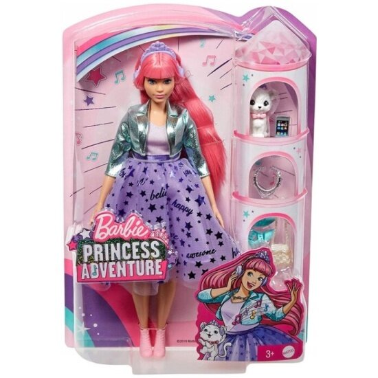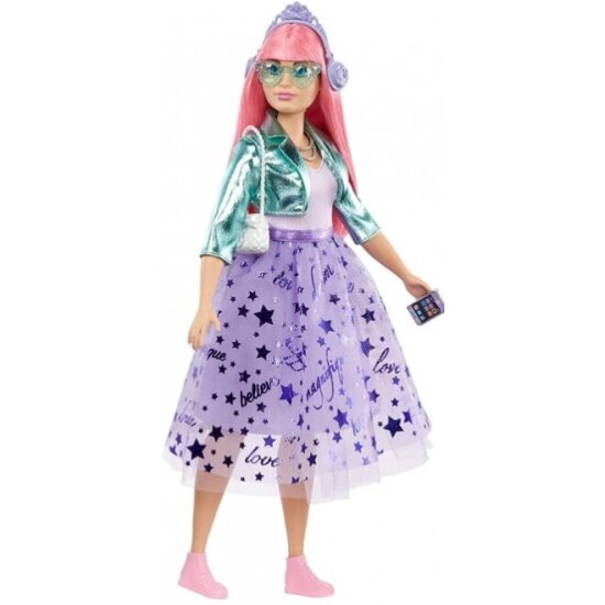 Нарядная кукла Барби с длинными розовыми волосами одета в сиреневый топ, мерцающую звездами пышную юбку, блестящую курточку и розовые ботинки. Образ дополнен аксессуарами - сумочкой, колье, солнцезащитными очками, смартфоном, туфельками. На любой гламурной вечеринке Барби сопровождает питомец с короной и ошейником.