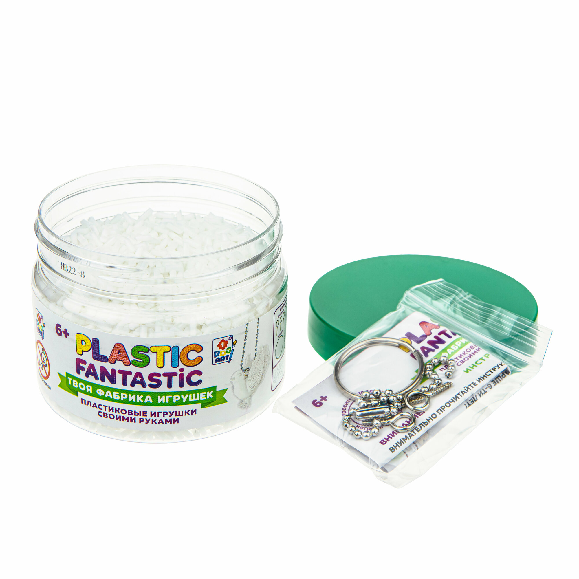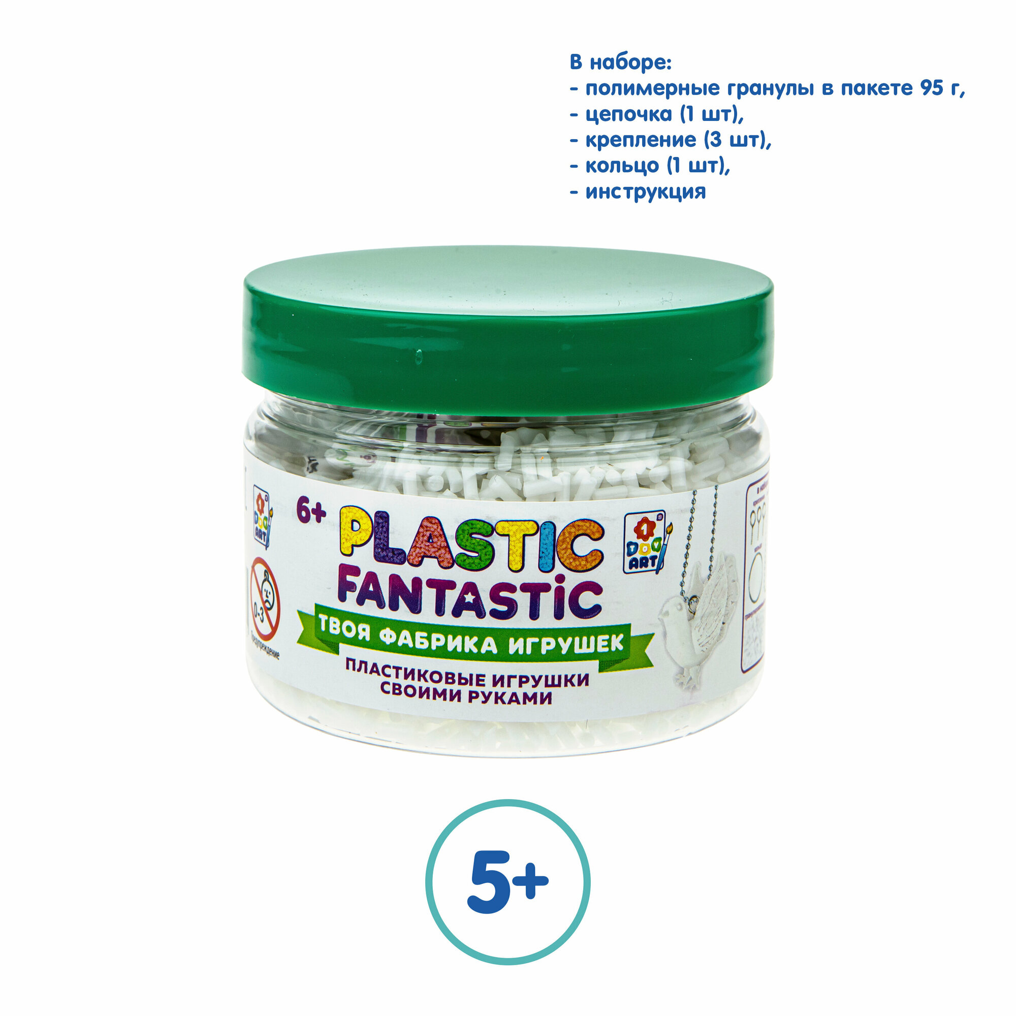 В баночке 95 г. белые пластиковые гранулы для творчества PLASTIC FANTASTIC - это эксклюзивная линейка наборов, с помощью которых можно изготовить разные игрушки из гранулированного пластика. Разноцветные гранулы пластика отлично растворяются в воде и превращаются в эластичный пластилин. Готовая игрушка снова станет обычным пластилином, если растопить ее в горячей воде. И можно лепить заново!