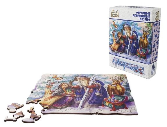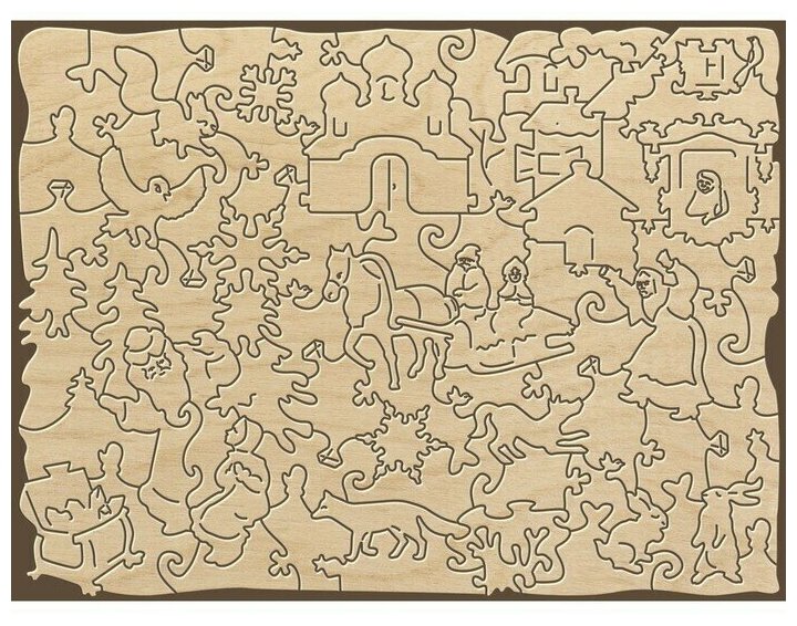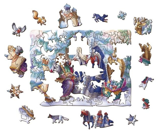 Фигурный пазл отличается от стандартного необычной формой деталей. Кроме того, часть деталей выполнены в форме предметов, связанных с тематикой картинки. В данном случае это, персонажи и предметы связанные со сказкой Морозко. Детали пазла выполнены из фанеры. Рисунок нанесен прямо на дерево с помощью специального принтера, он долговечен и не сотрется даже после многократных сборок. Такой пазл понравится и детям и взрослым, ведь сборка доставляет визуальное и тактильное удовольствие.