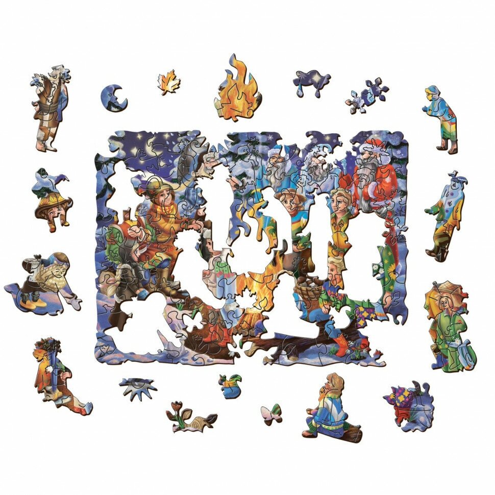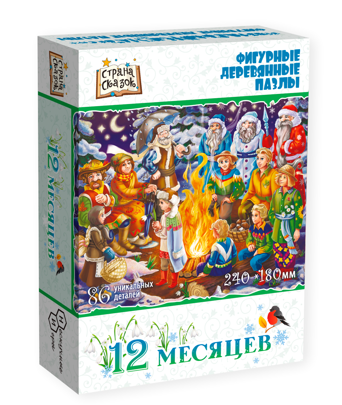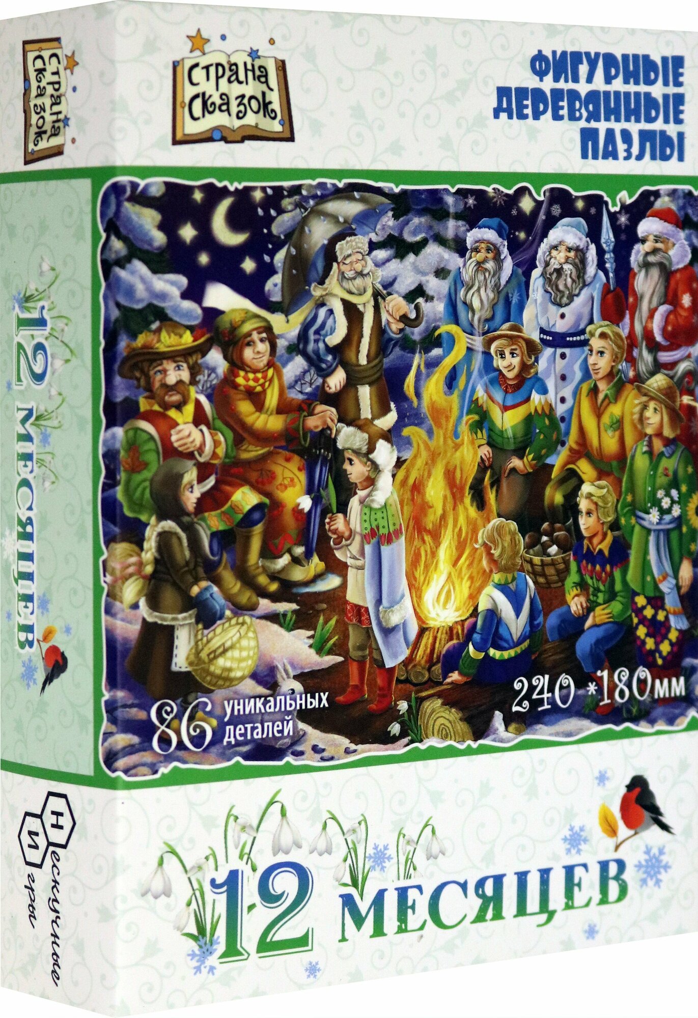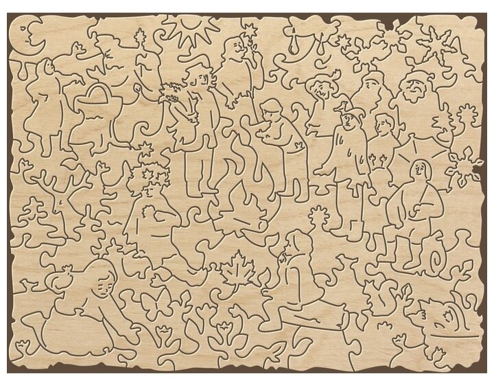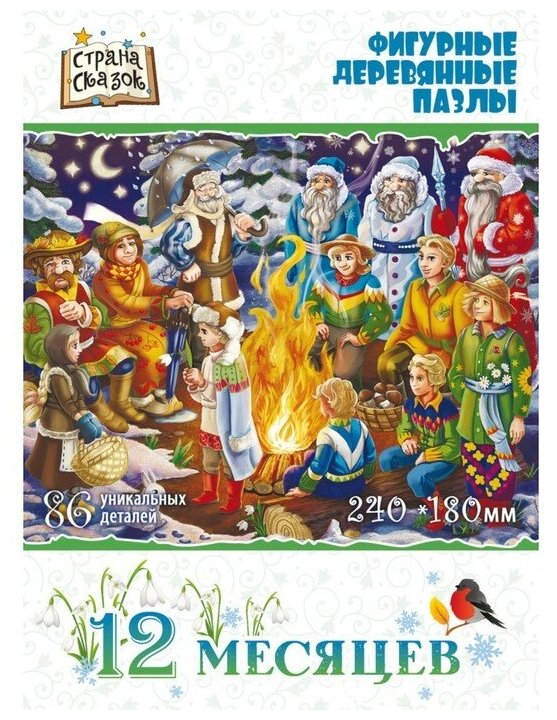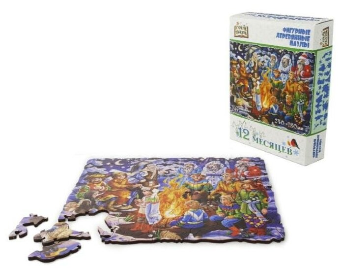 Фигурный пазл отличается от стандартного необычной формой деталей. Кроме того, часть деталей выполнены в форме предметов, связанных с тематикой картинки. В данном случае это, персонажи и предметы связанные со сказкой 12 месяцев. Детали пазла выполнены из фанеры. Рисунок нанесен прямо на дерево с помощью специального принтера, он долговечен и не сотрется даже после многократных сборок. Такой пазл понравится и детям и взрослым, ведь сборка доставляет визуальное и тактильное удовольствие.