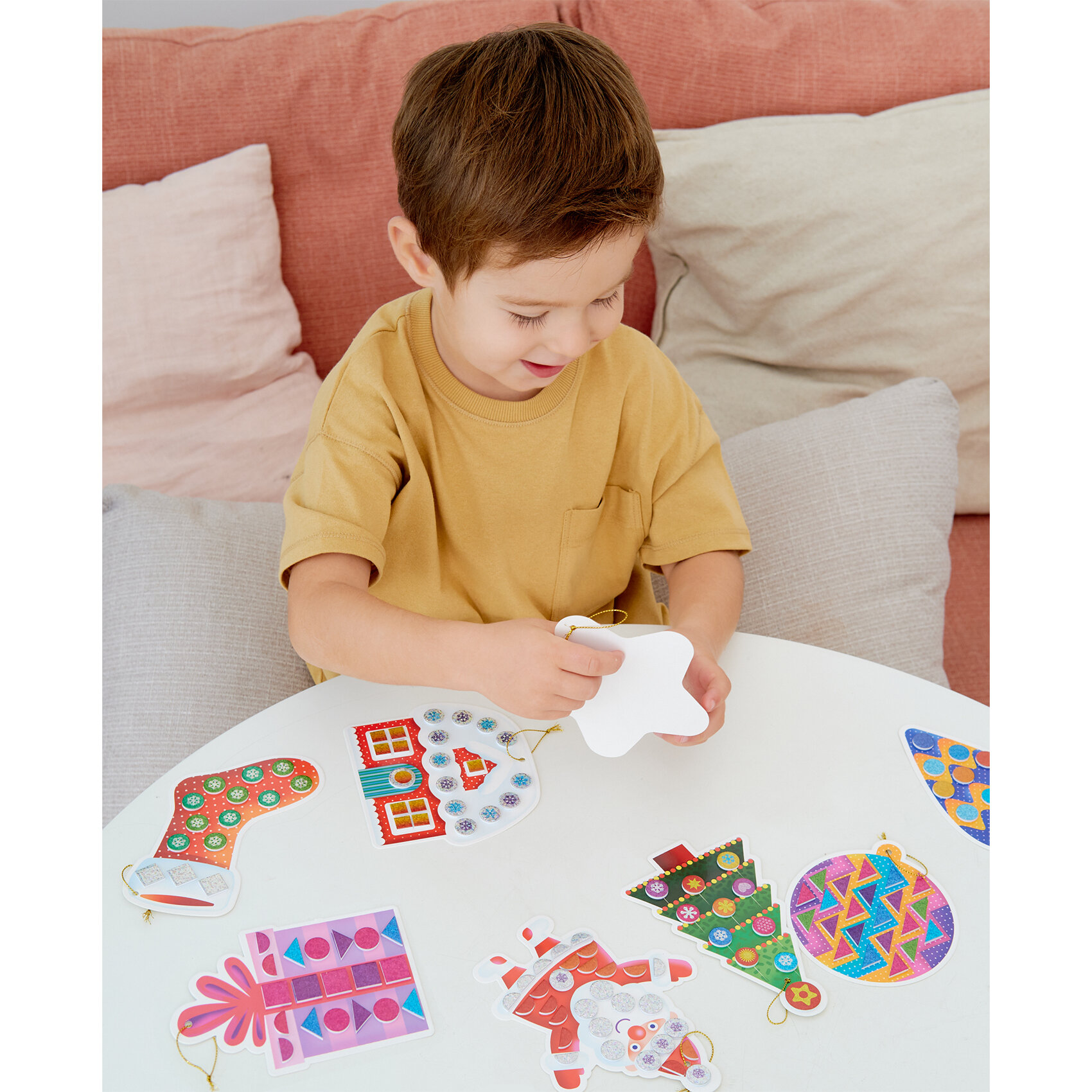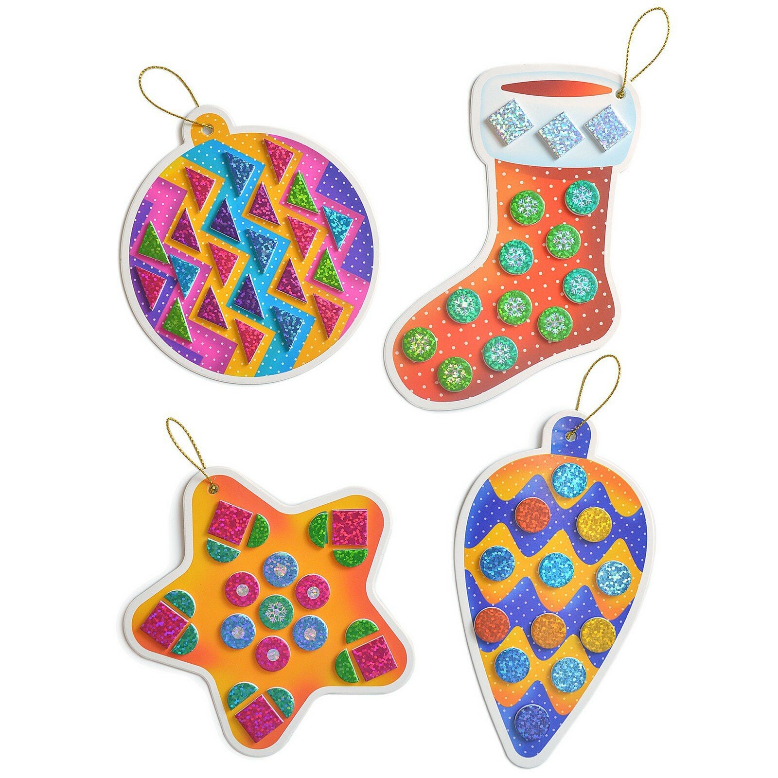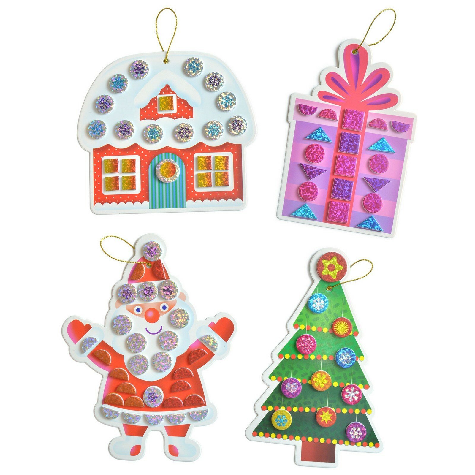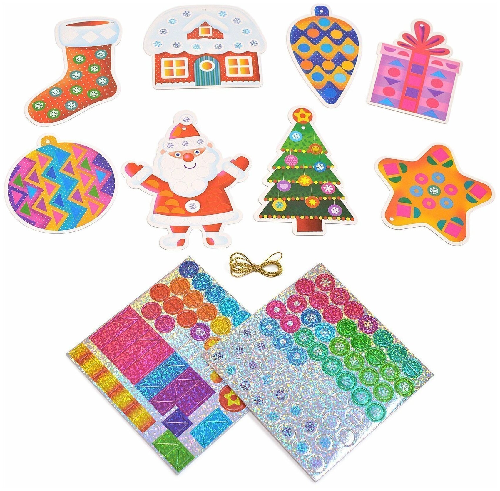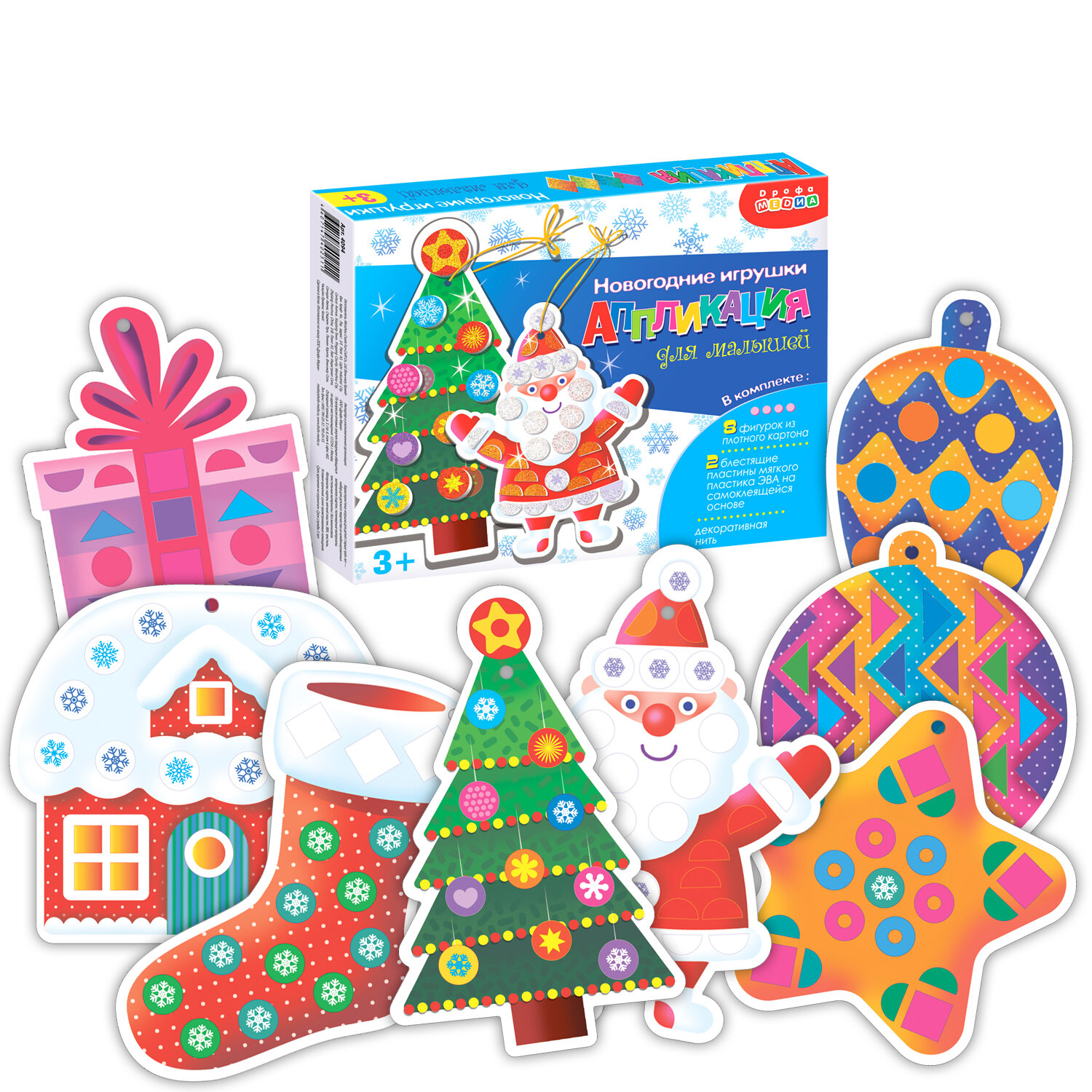 В коробке вы найдёте всё для создания замечательных поделок. В комплекте 8 симпатичных игрушек из картона, которые нужно украсить разноцветными деталями из мягкого пластика ЭВА с голографической плёнкой. Все детали уже вырезаны и готовы к работе. Нужно лишь аккуратно отделить их от основы и приклеить на фигурку. У каждой игрушки есть отверстие для декоративной нити для подвешивания. Готовые игрушки можно повесить на ёлку или украсить ими комнату.