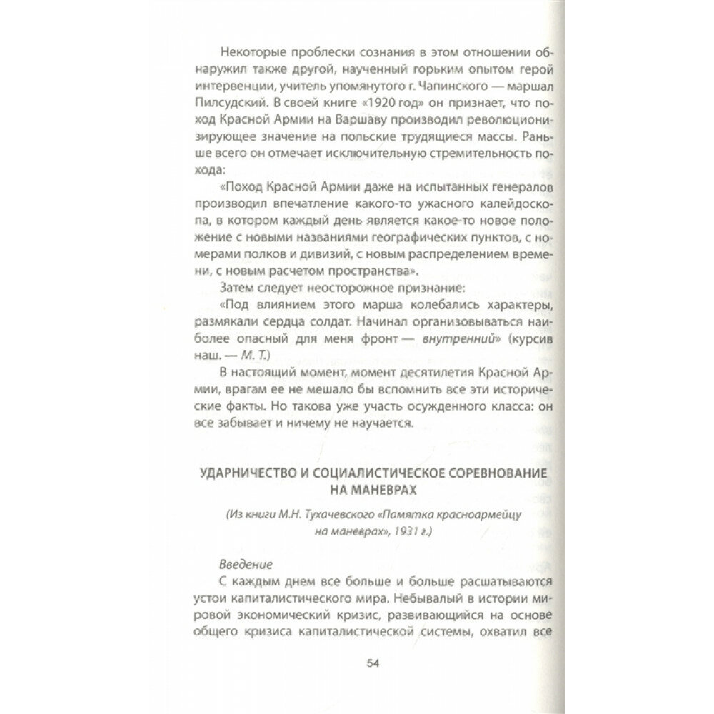 Опубликованные в книге материалы 1919-1934 г.г. – доклады, выступления в прессе, «Памятка красноармейцу на маневрах» и др. свидетельствуют о грамотности Тухачевского в военном и политическом отношениях. Они, на мой взгляд, верно отражают успехи СССР в строительстве социалистического общества, в необходимости укрепления обороноспособности государства перед империалистической и фашистской агрессиями.