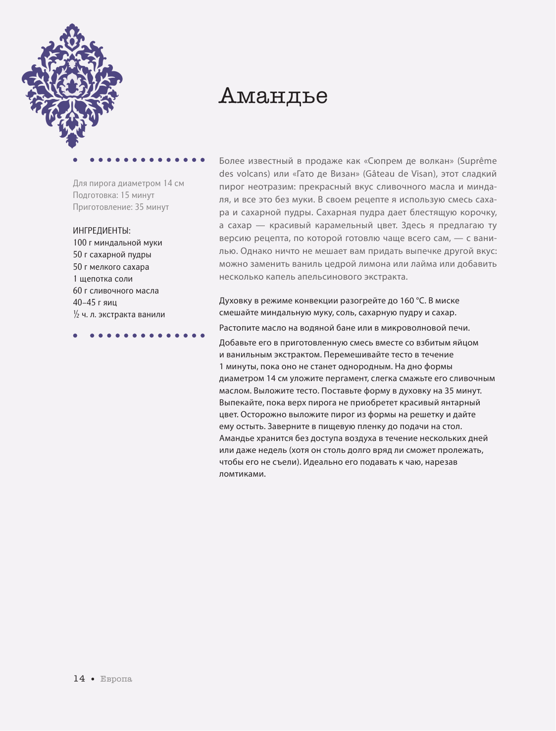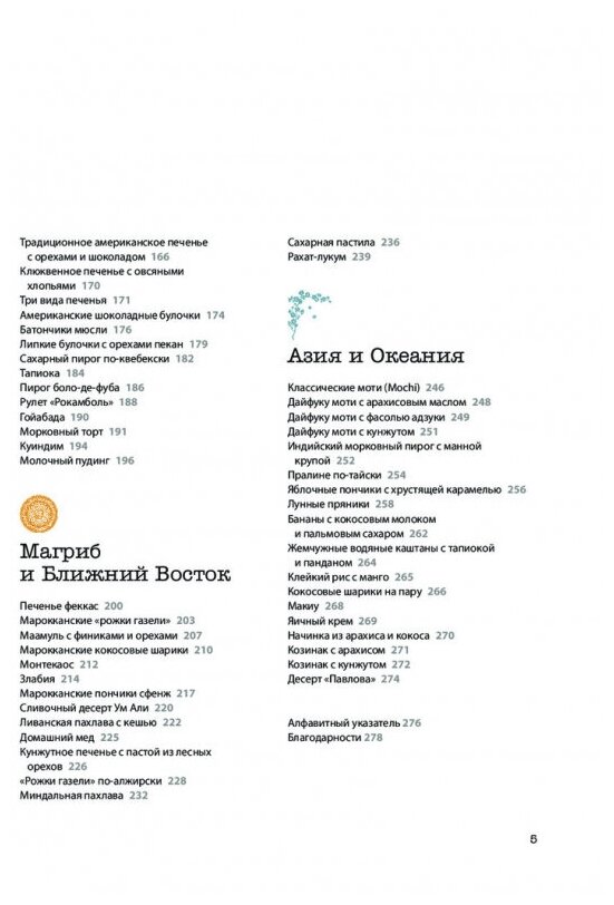 Автор знакомит с рецептами десертов из Америки, Европы, Индии, Японии, Океании и др, что сразу выделяет книгу среди других кулинарных сборников. Такое количество разнообразных в географическом плане местных, можно даже сказать национальных рецептов, надо еще поискать. Рецепты могут показаться сложными, но автор действительно потрудился адаптировать их для человека с любым уровнем кулинарных навыков: описание одного рецепта занимает от 1 до 3 страниц, указаны порции и время приготовления, для некоторых этапов есть наглядная демонстрация действий в виде фотографий. Оформление красивое, рецепты сопровождают фото готовых блюд, страницы имеют разные цвета. Я довольна покупкой, книга настоящая находка!