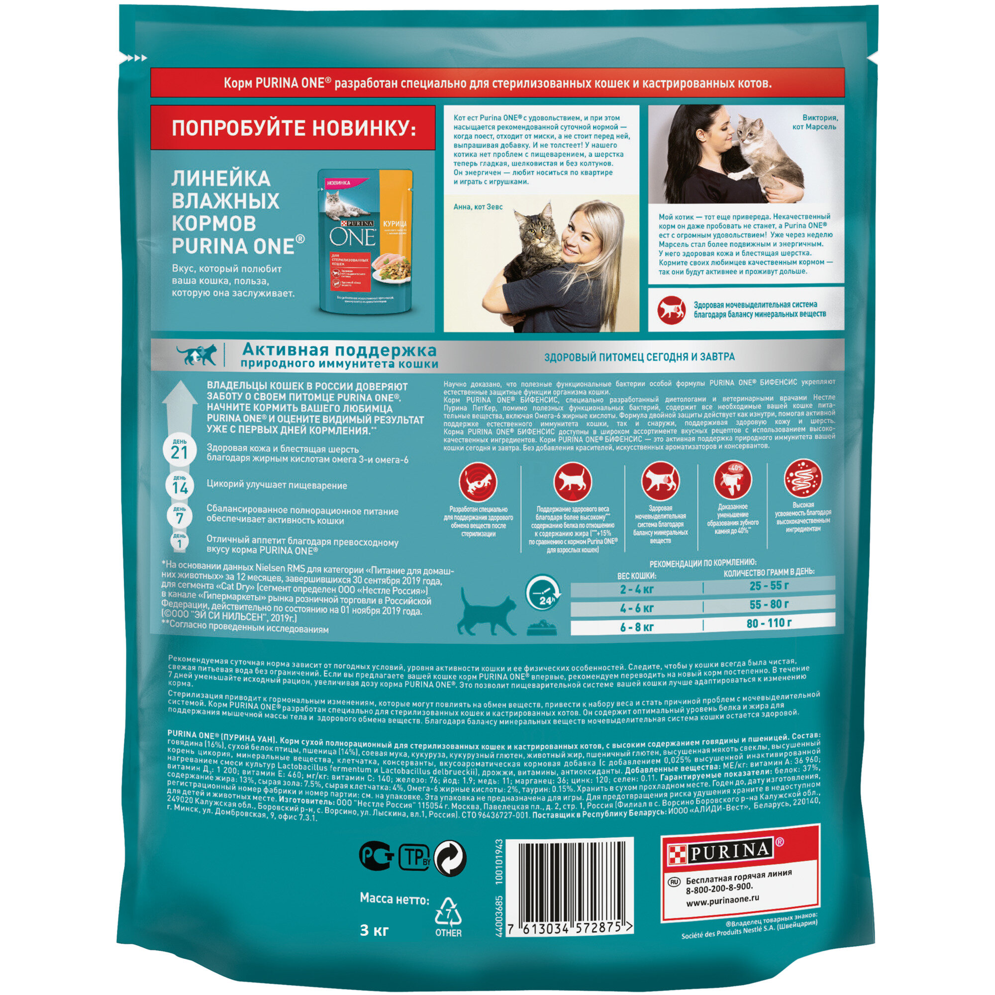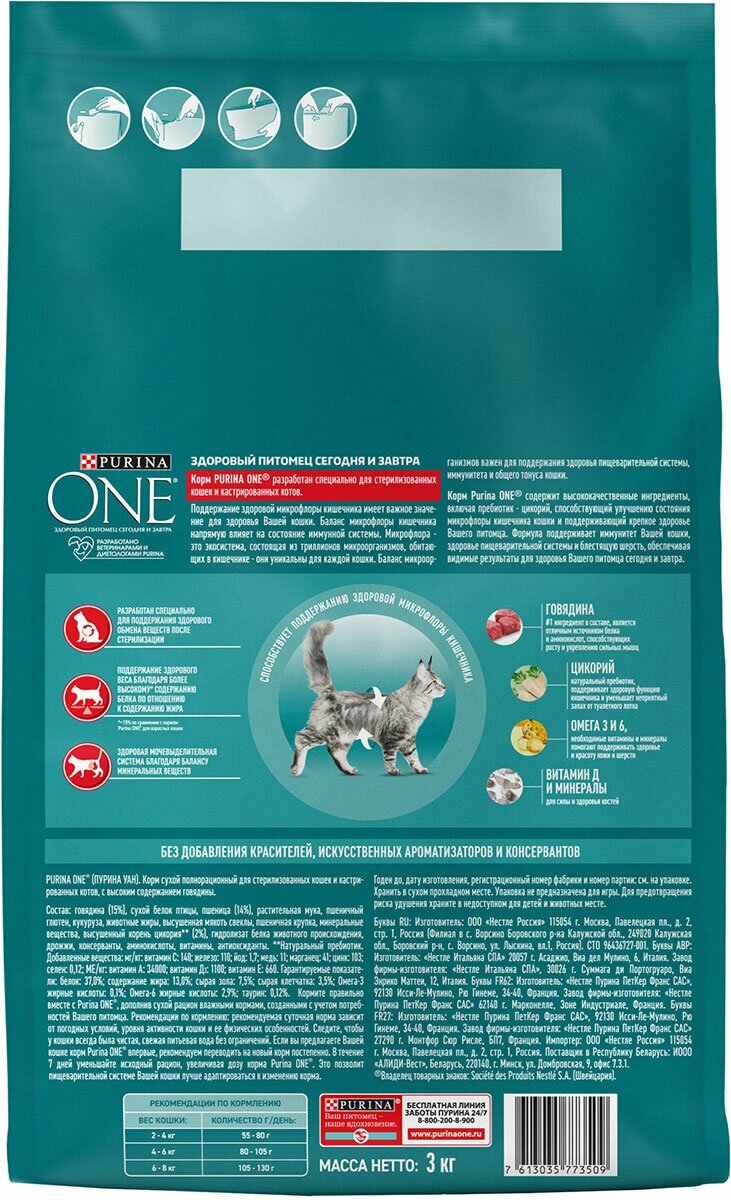 Корм для стерилизованных кошек и котов Purina ONE с говядиной и пшеницей идеально подходит для животных, прошедших процедуру стерилизации или кастрации. Так как после этой процедуры у кошек меняется гормональный фон и снижается активность, иногда это приводит к повышенному аппетиту и, как следствие, к набору лишнего веса. Поэтому кормить животных стоит с учетом изменившихся обстоятельств, в соответствии с которыми и был разработан сухой корм для стерилизованных кошек и котов Purina ONE.