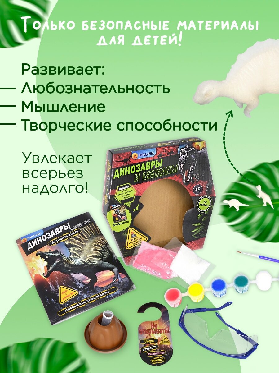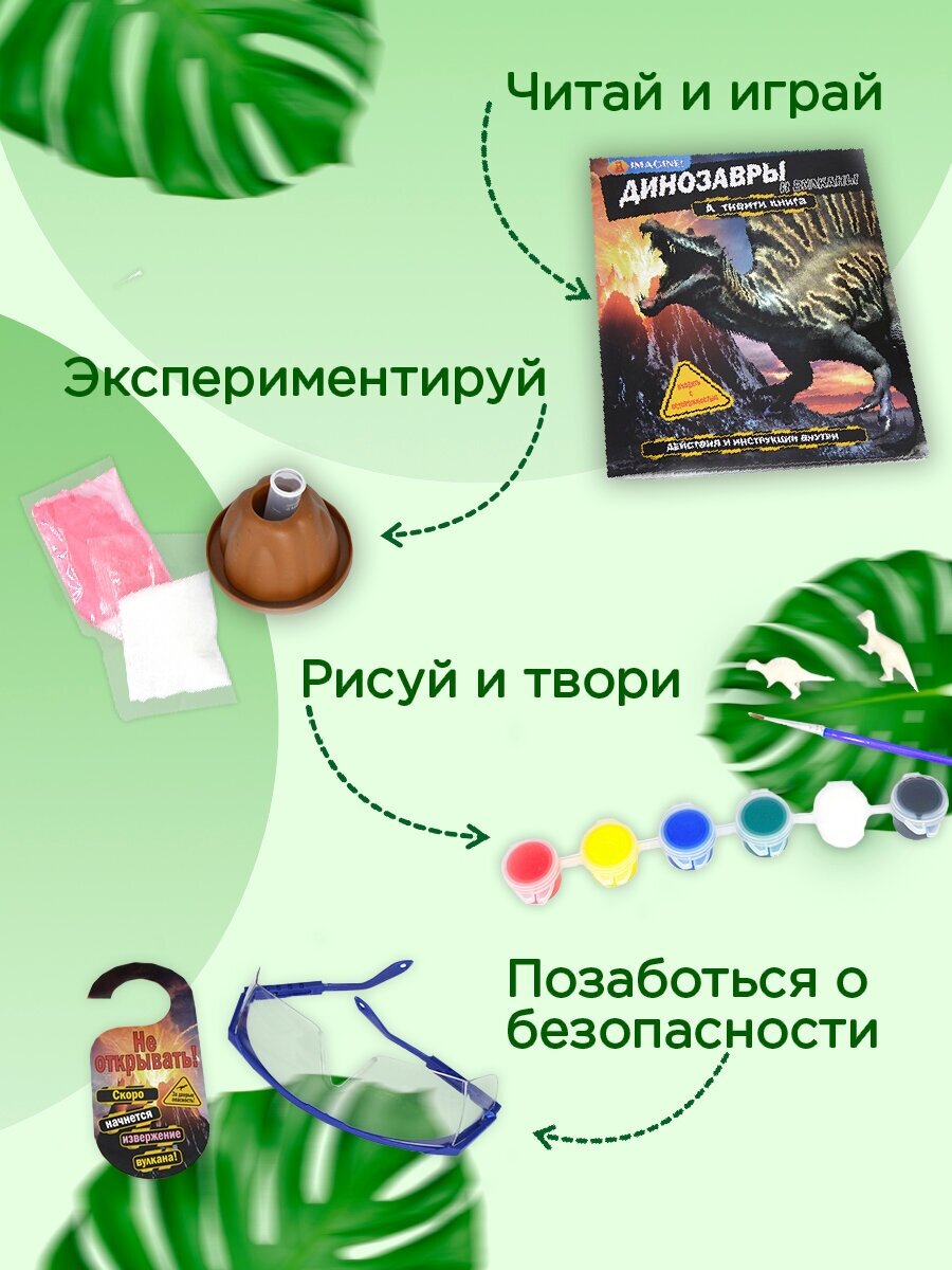 В наборе: книга-инструкция, 6 красок, 2 модели динозавров, Модель для создания извержения вулкана, 1 кисть для рисования, пищевая сода, лимоная кислота, измерительная трубка, защитные очки, 1 табличка на дверную ручку.