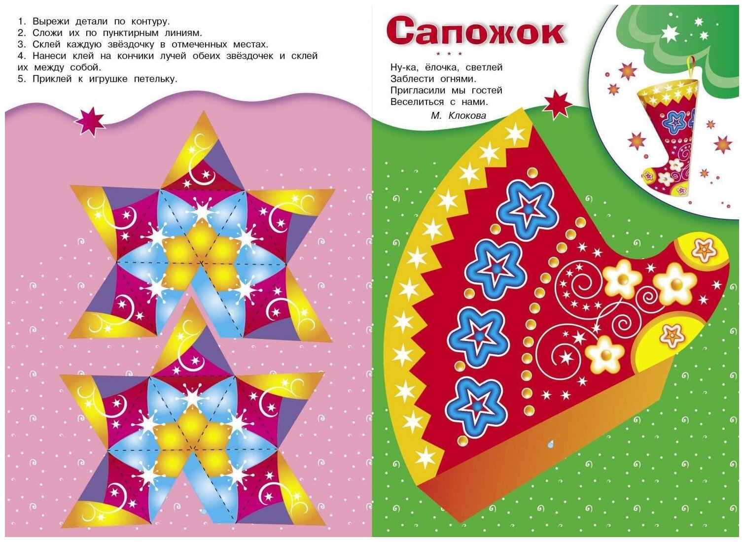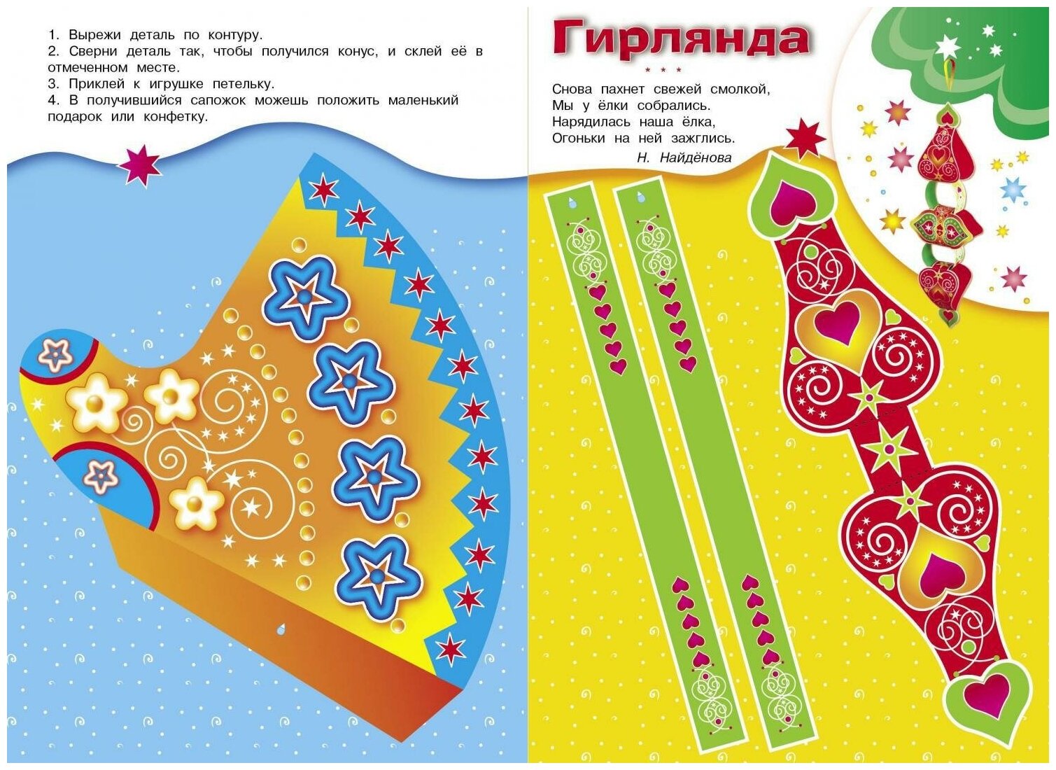 Подарите своему ребёнку радость творчества! Эта чудесная книжка поможет ему смастерить яркие и оригинальные ёлочные украшения. Для этого понадобятся только ножницы и клей. Получившиеся поделки можно будет повесить на ёлку или подарить бабушкам и дедушкам, братьям и сёстрам.