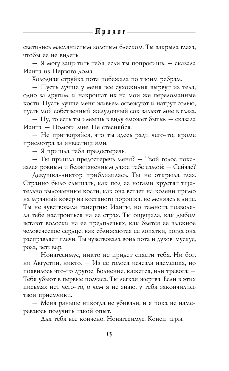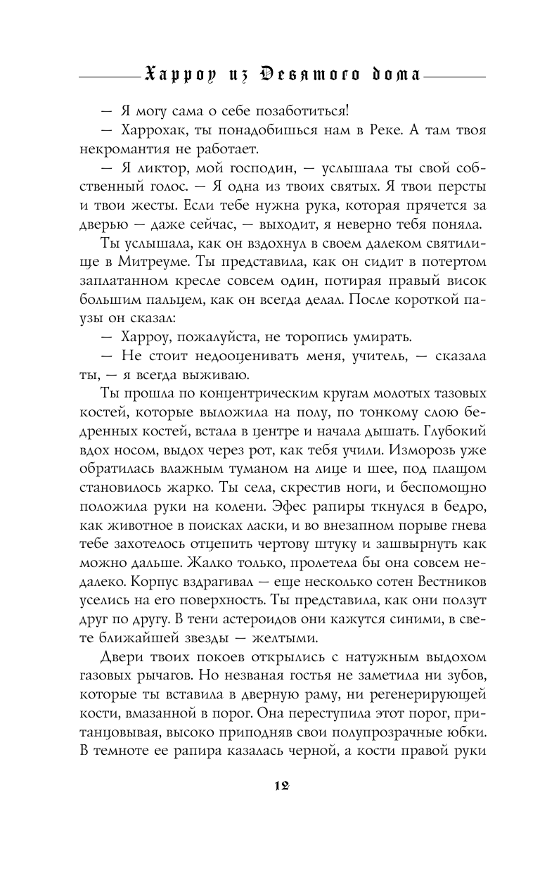 Серию начинала читать в оригинале. Если «Гидеон» еще получилось осилить, то с этой книгой я потерпела фиаско. Благо, как потом оказалось, дело не в моем деградирующем английском. Даже на родном великом и могучем оказалось сложновато вникнуть в суть происходящего, поначалу все запутанно, непонятно что и к чему. Но в дальнейшем сюжетные линии сплетаются, образуя более ясную картину. Книга по стилистике отличается от первой части, но это не делает ее менее увлекательной. Здесь автор позволяет лучше узнать Харроу, ее характер, переживания. Однозначно продолжу следить за серией