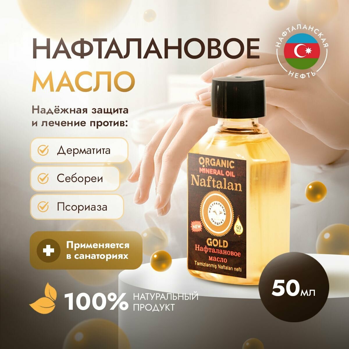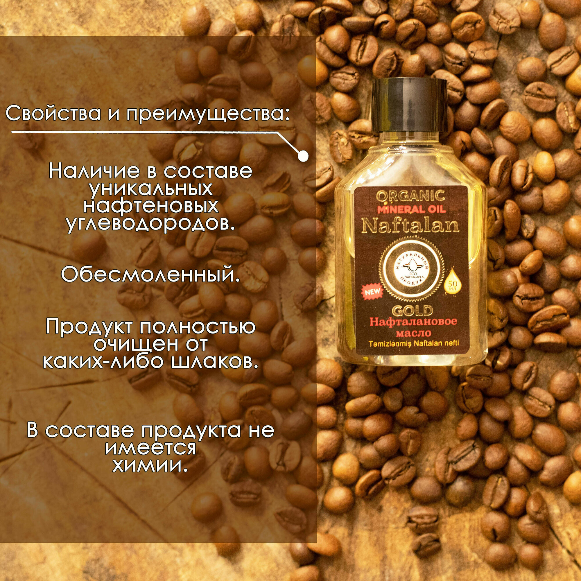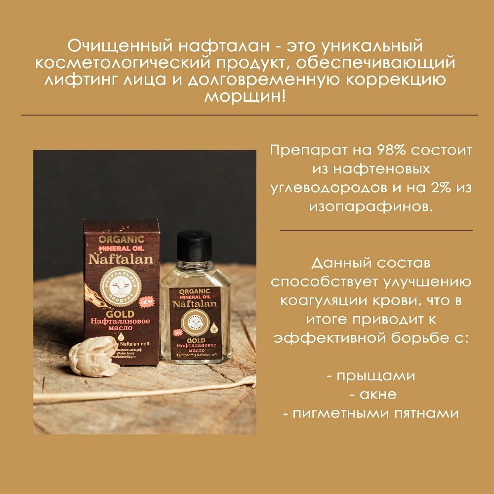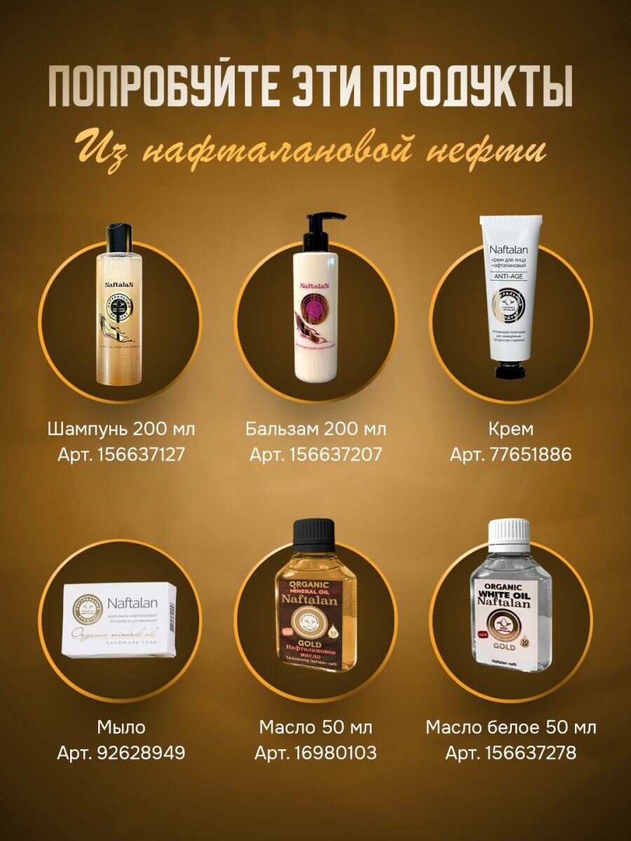 Нафталановое масло - это полностью органический продукт, не имеющий в своём составе химии и лечащий такие заболевания как псориаз, витилиго, экзема, себорея, дерматит, нейродермит и заболевания опорно-двигательного аппарата. Благодаря наличию в составе уникальных нафтеновых углеводородов, которые очень легко проникают в организм через открытые поры, масло моментально улучшает коагуляцию крови, что так же способствует коррекции морщин, помогает в борьбе с акне и выпвдением волос!Весь курс лечения: всего 21 дней! Уже на 5-ом дне использования нафталана вы почувствуете как зуд и неприятные ощущения, вызванные заболеванием, сходят на нет; а на 7-ом дней лечения, станут уменьшаться покраснения и корочки, так как улучшение коагуляции крови приведёт к лифтингу кожи и восстановлению эпидермиса. Но нужно обязательно использовать нафталан ровно 21 дней, чтобы заболевание покинуло вас с корнем.Лечение нафталановым маслом помогает стабилизировать процесс кератинизации кожи, увеличить количество клеток Лангерганса, которые укрепляют иммунную систему, и равномерно распределить их по эпидермису. При лечении заболеваний женской репродуктивной системы нафталанотерапия позволяет избавиться или уменьшить воспалительный процесс и снизить дискомфорт и болевые ощущения, стимулирует иммунную систему и кровообращение органов малого таза. Важными качествами нафталана здесь выступают его бактерицидные свойства, а также он улучшает питание тканей, помогает заживлять рубцы и размягчать швы.Для удобства покупателей и на случай, если вы захотите просто убедиться в эффективности продукции, имеются три размера: 250 мл, 100 мл и 50 мл! Нафталановое масло содержится в весьма герметичном флаконе, в котором масле с лёгкостью можно согревать в водяной бане при каждом использовании.Масло проходит период сложного очищения от шлаков процессом вакуумного рафинирования и разложения на фракции. Подобный процесс делает масло полностью обессмоленным и антиаллергенным, благодаря этому нафталаном можно лечить даже детей!Ждём ваших положительных результатов!