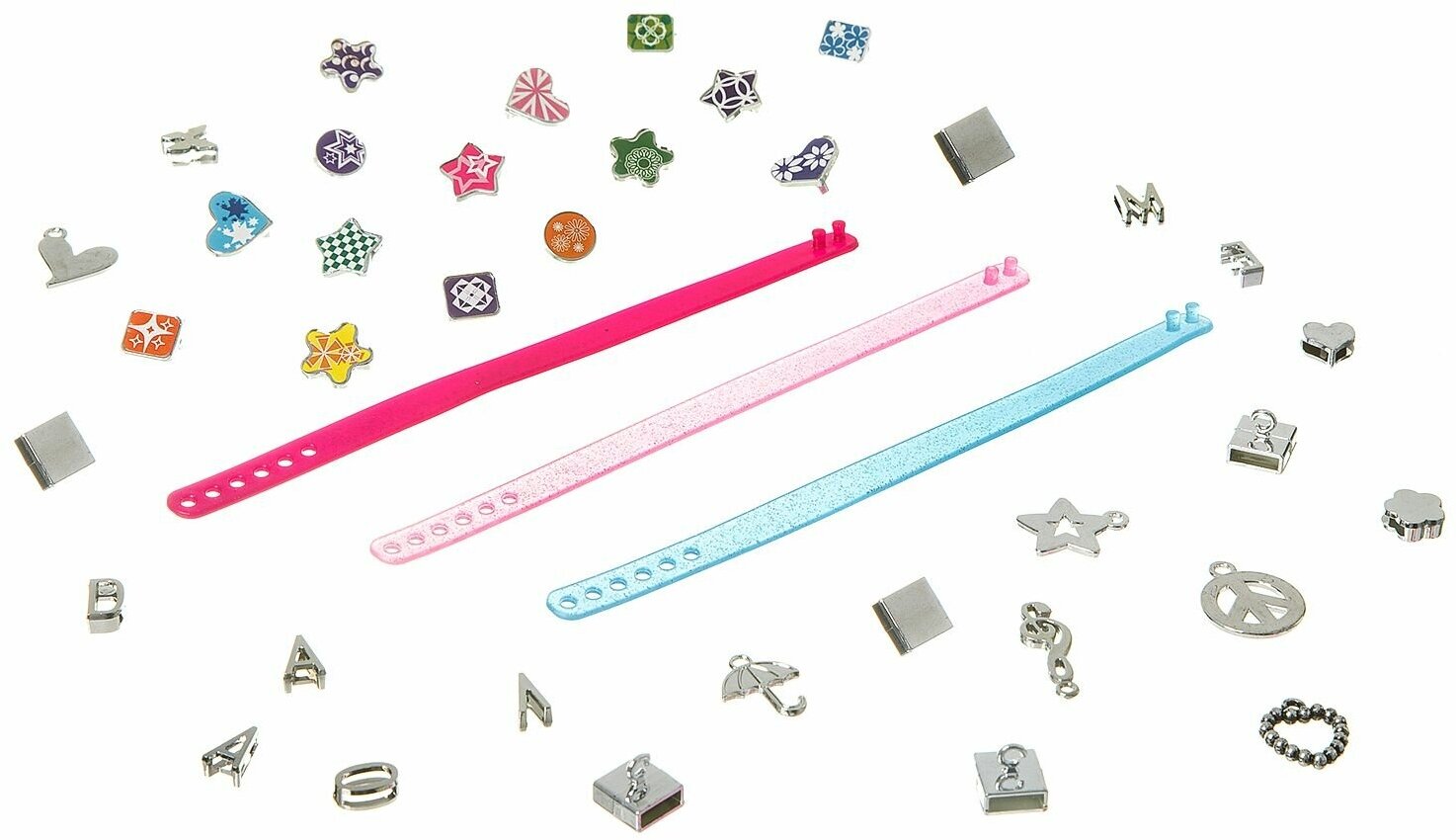 Комплект: ремешки для браслетов - 3 шт, цветные украшения-"ползунки" - 15 шт, серебристые украшения-"ползунки" и подвески - 22 шт.