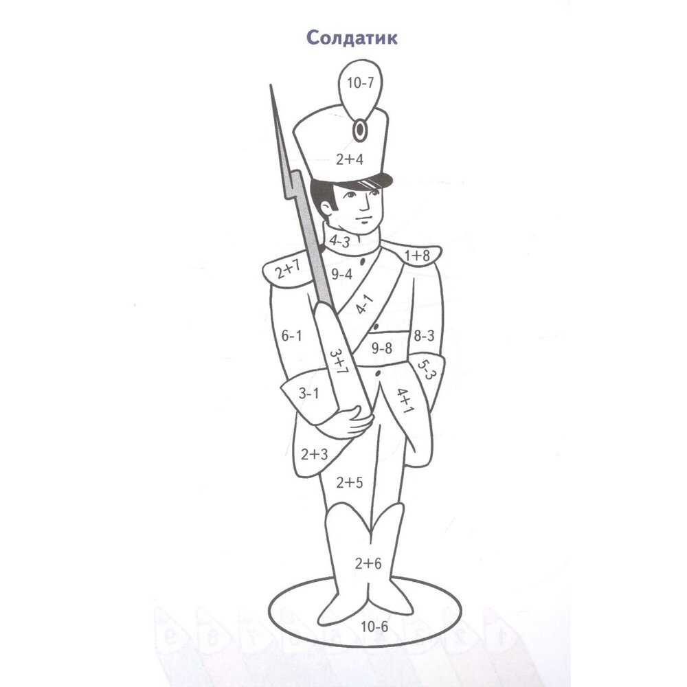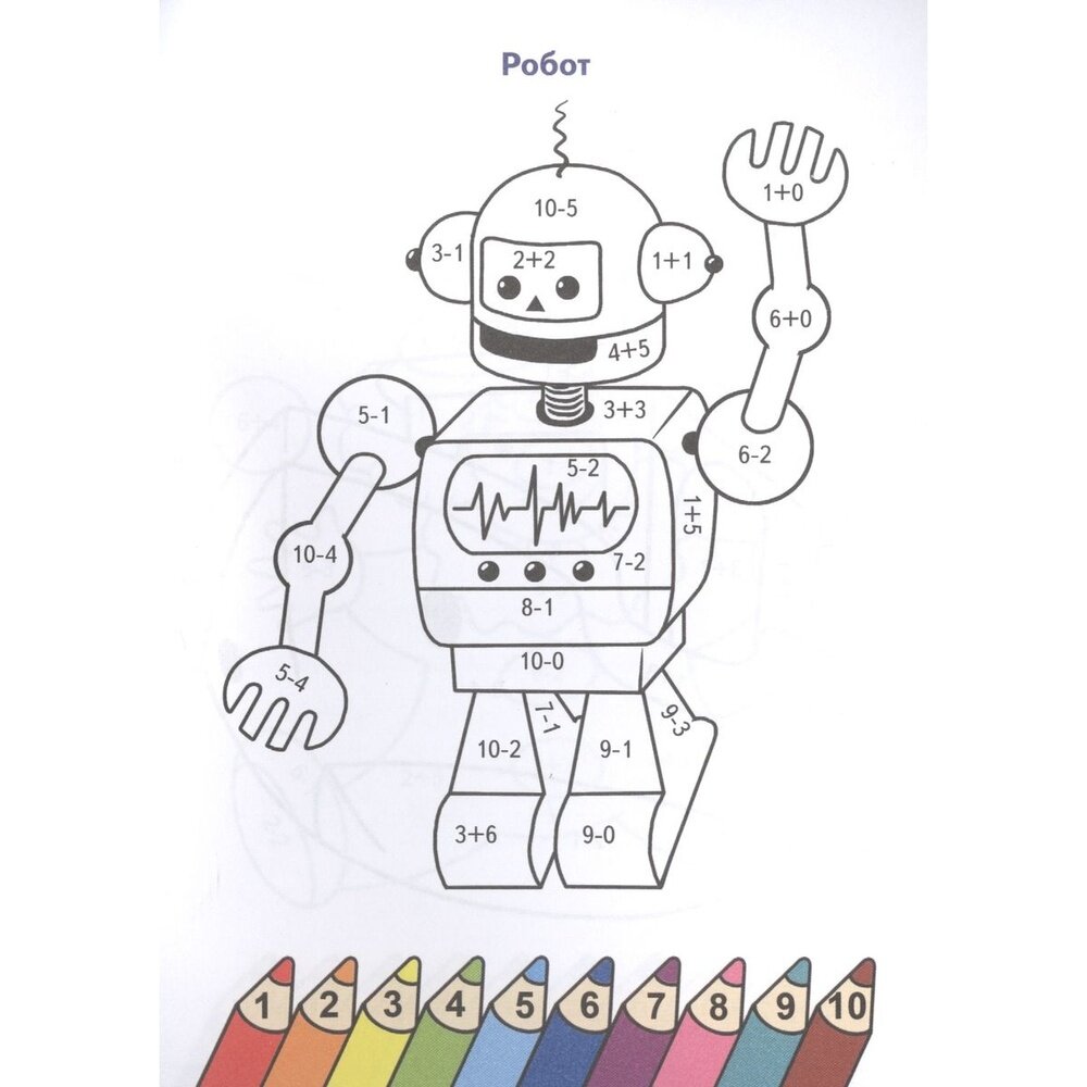 Привет, юный художник! Перед тобой не простая раскраска, а математическая! Решай пример за примером и узнаешь, каким карандашом надо раскрасить ту или иную деталь картинки. Проверить себя ты можешь, заглянув на оборот обложки. Не спеши, постарайся всё сделать самостоятельно.