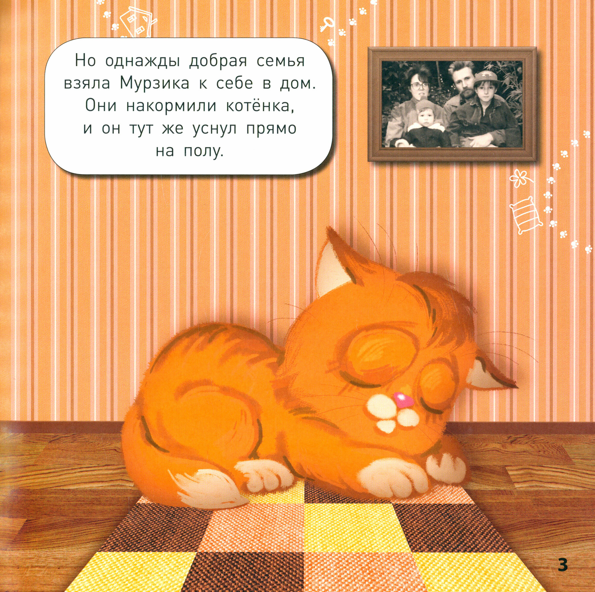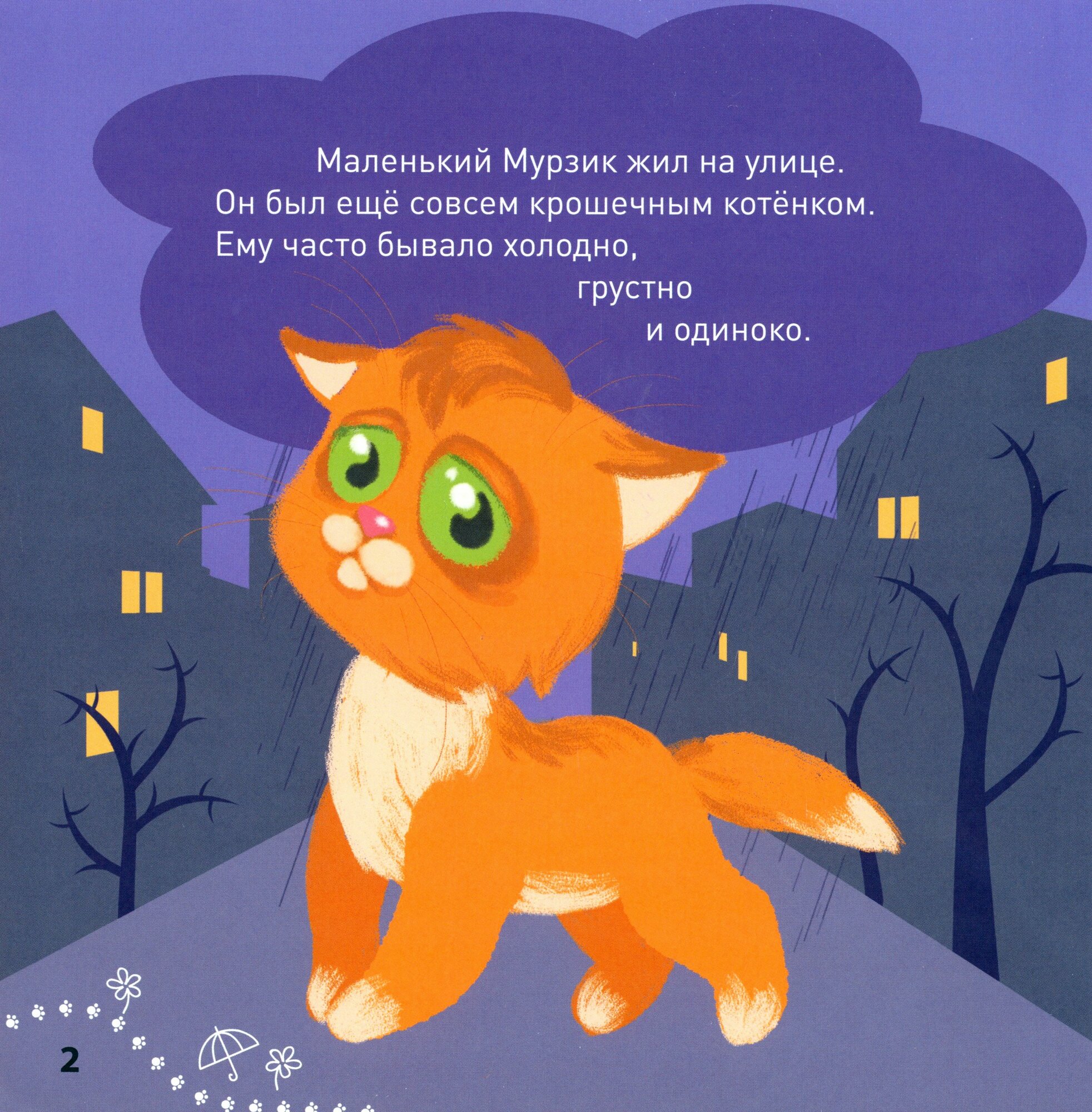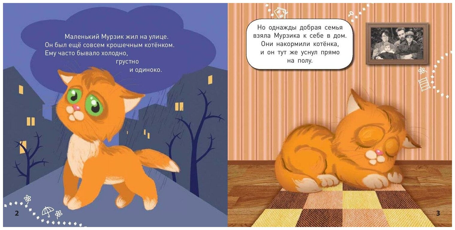 Маленький котенок Мурзик жил на улице, и ему часто бывало холодно, грустно и одиноко. Но однажды добрая семья взяла его к себе в дом. Теперь Мурзику тепло и уютно. А еще в доме столько интересного!