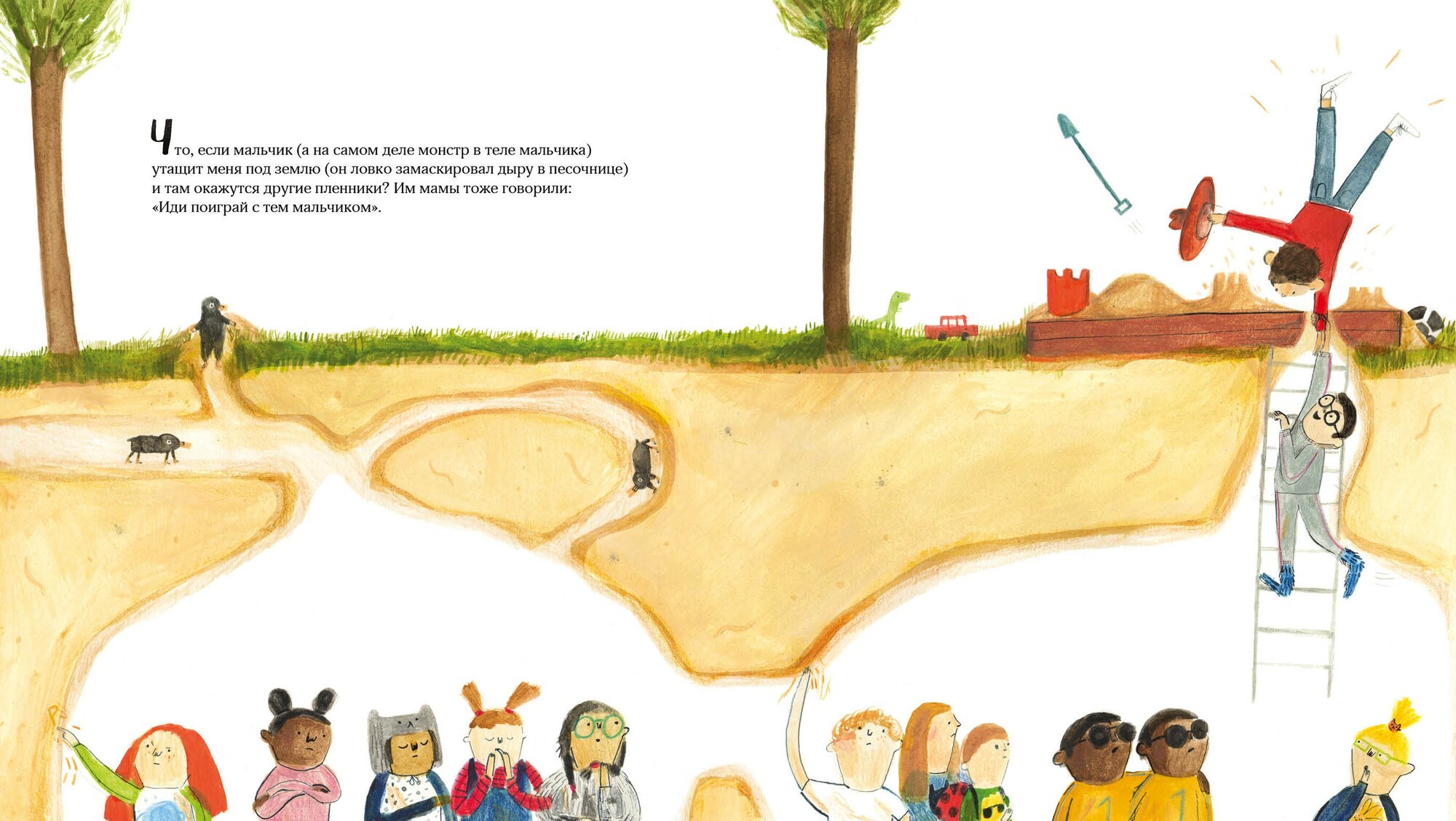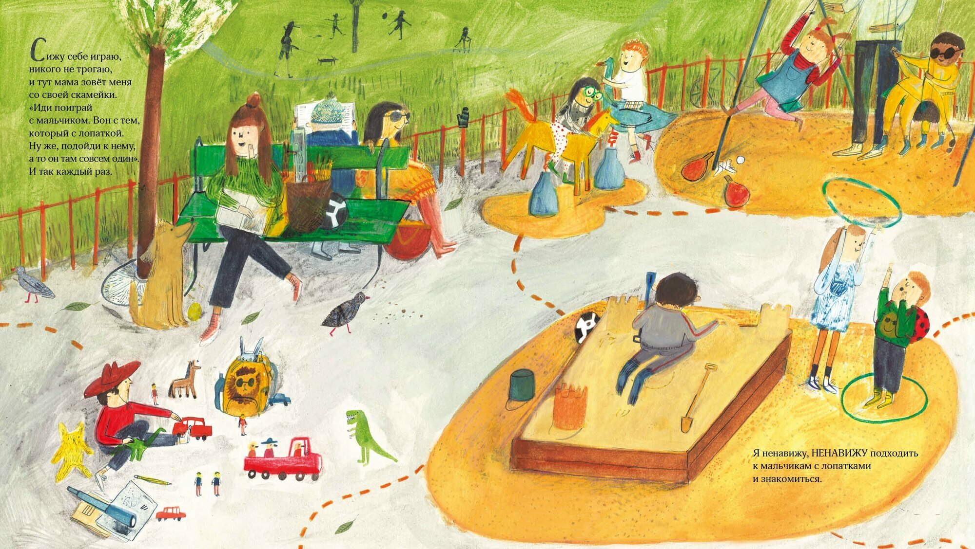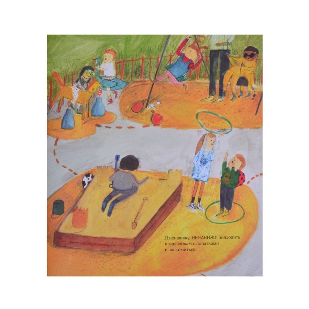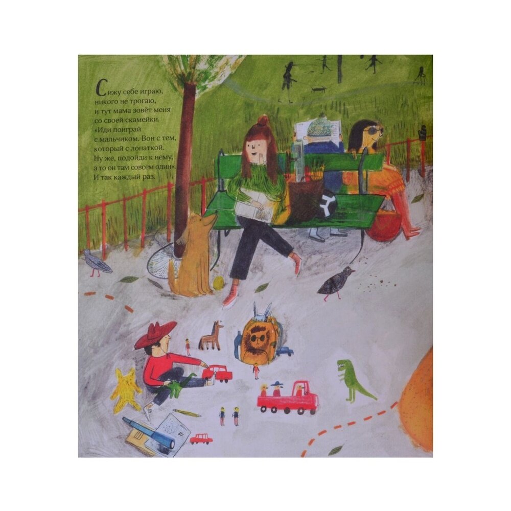 Родители часто с лёгкостью распоряжаются, с кем дружить маленьким детям, не задумываясь, а хочет ли малыш знакомиться, играть вместе, делиться игрушками. Книжка-картинка по-доброму указывает на право ребёнка самостоятельно распоряжаться своим временем на прогулке. Смешные детальные иллюстрации и закрученный сюжет дают заряд вдохновения для фантазёров и сочинителей лет с 4. Рисовать, придумывать свои истории, дружить и играть с теми, с кем хочется!