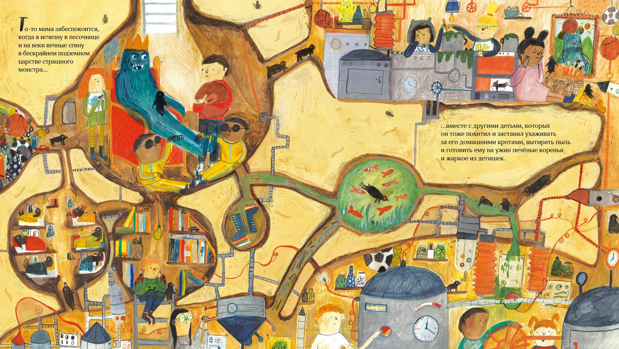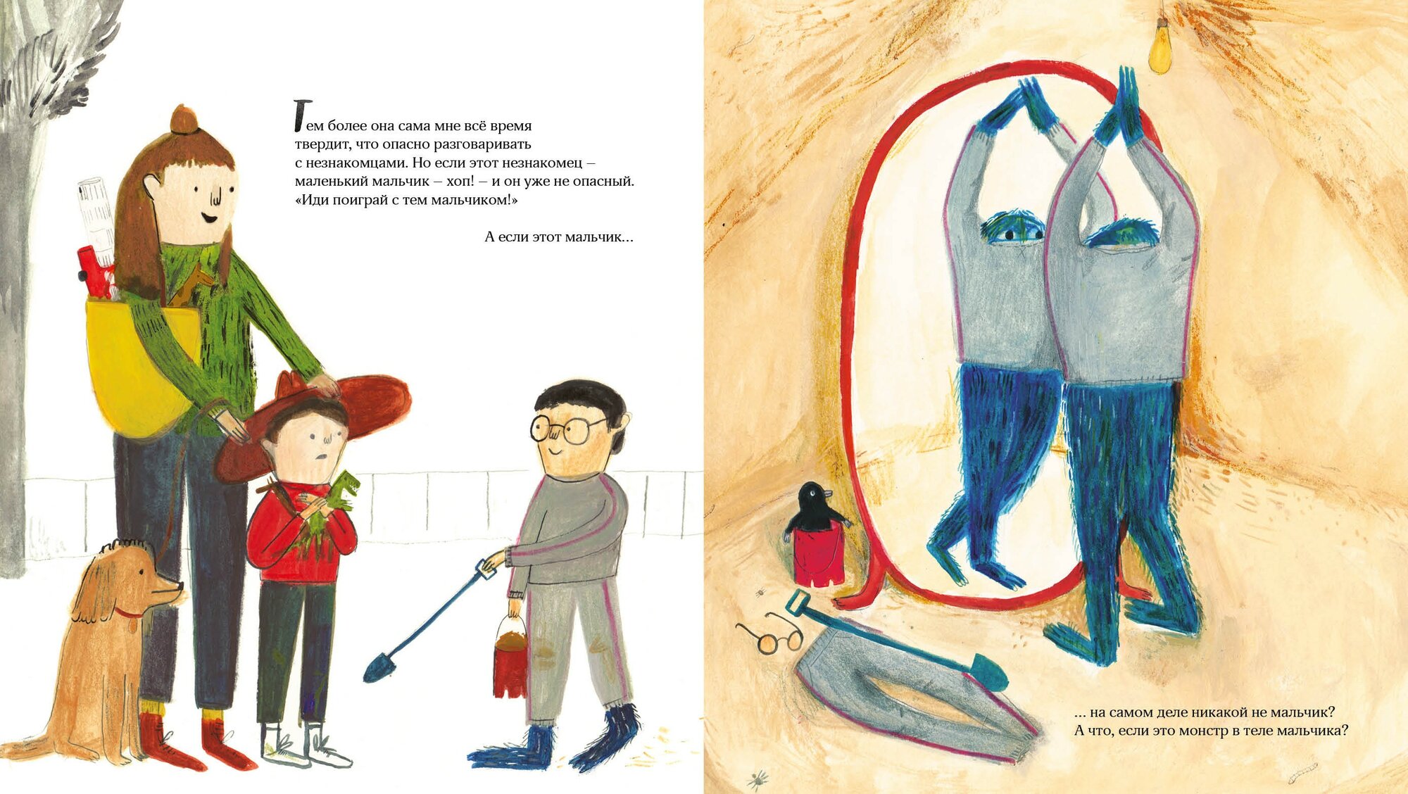 Очаровательная книжка – сколько всего интересного для разглядывания). С чисто французским шармом и французской же независимостью. Уже на титуле гордо стоит очень независимый мальчик – это история про него). Мама вечно отправляет его познакомиться «с тем мальчиком – ему так одиноко». И однажды после такого знакомства разыгрывается настоящий триллер. Не буду раскрывать карты, но удирать придется из подземелья, прорывая ход детскими лопатками. Картинки – ухохотаться можно). Особенно запоминаются волосатые лапы монстра, которые расчесывают покорные пленники. А кунг-фу пантеры с чудовищем – просто до слез).