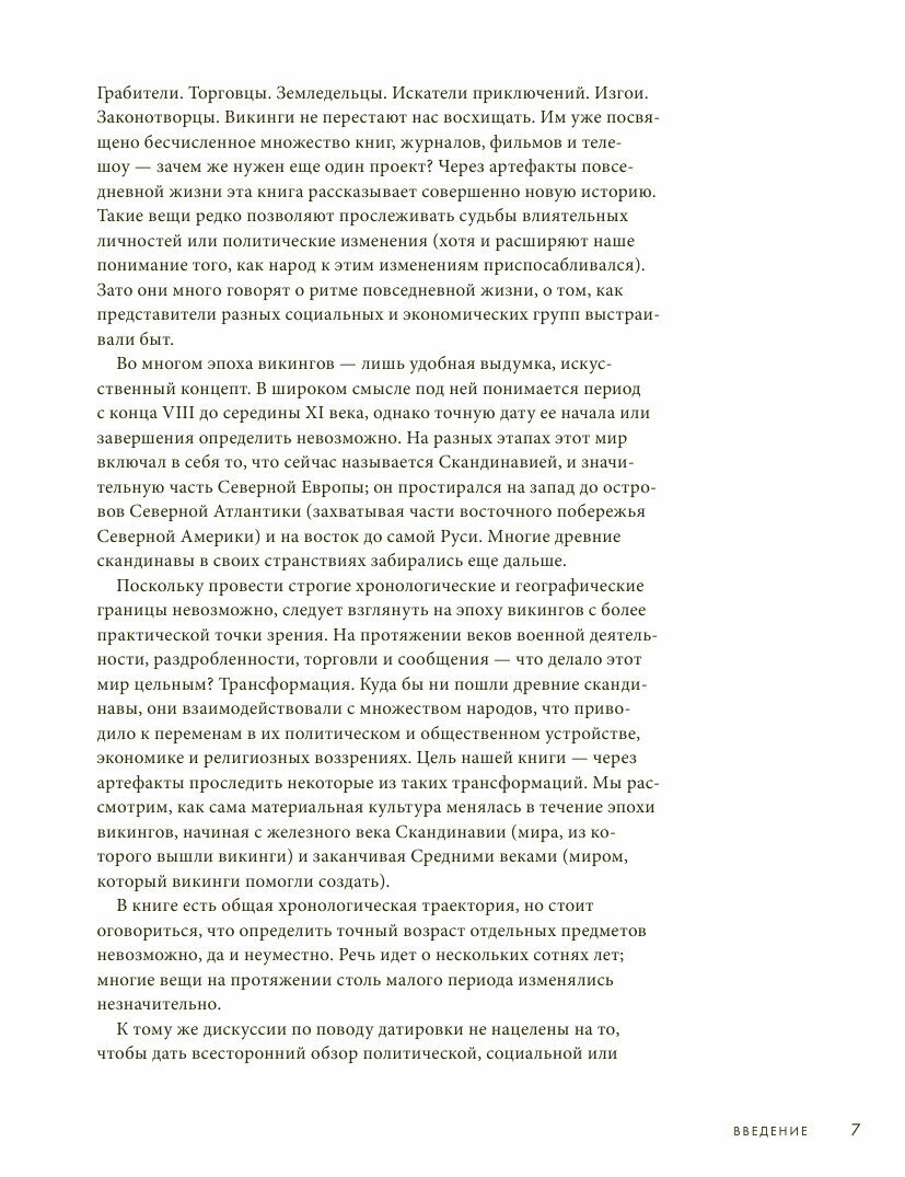 Грабители. Торговцы. Земледельцы. Искатели приключений. Изгои. Законотворцы. Викинги, какими бы мы их ни представляли, не перестают нас восхищать. Им уже посвящено бесчисленное множество книг, журналов, фильмов и телешоу — зачем же нужен еще один проект? Через артефакты повседневной жизни эта книга рассказывает совершенно новую историю. Такие вещи редко позволяют прослеживать судьбы влиятельных личностей или политические изменения (хотя и расширяют наше понимание того, как народ к этим изменениям приспосабливался). Зато они много говорят о ритме повседневной жизни, ритуальной и мирской, о том, как представители разных социальных и экономических групп выстраивали быт. Артефакты не просто дают ощутить смутную, едва уловимую связь с людьми прошлого — они побуждают задавать вопросы, которые в иной ситуации могли не возникнуть.
