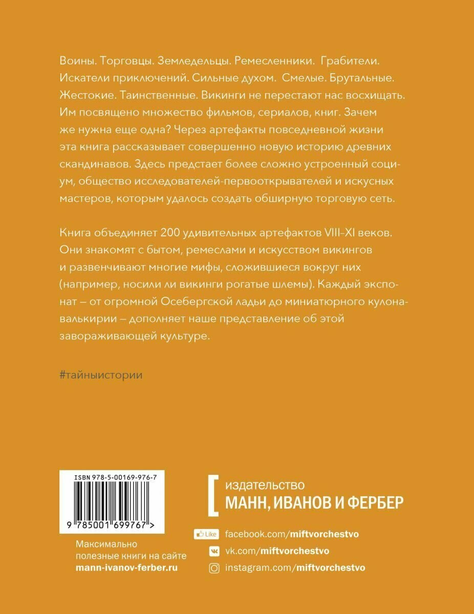 В книге представлены артефакты, не только собственноручно изготовленные древними скандинавами, но и встречавшиеся им в походах (там за ними часто тянулся заметный след). Это уникальный шанс взглянуть на миры, по которым путешествовали викинги, и народы, с которыми они сталкивались.