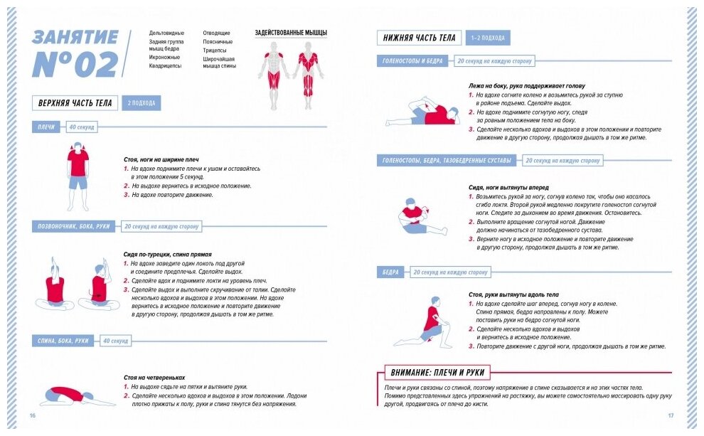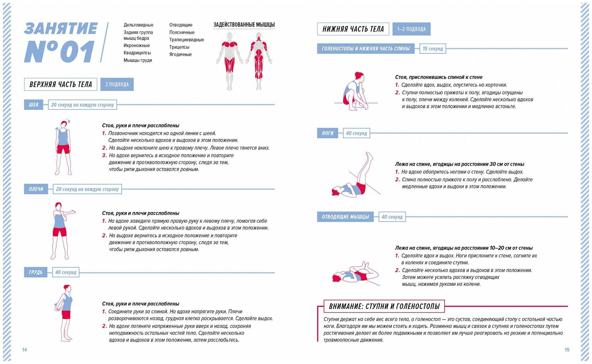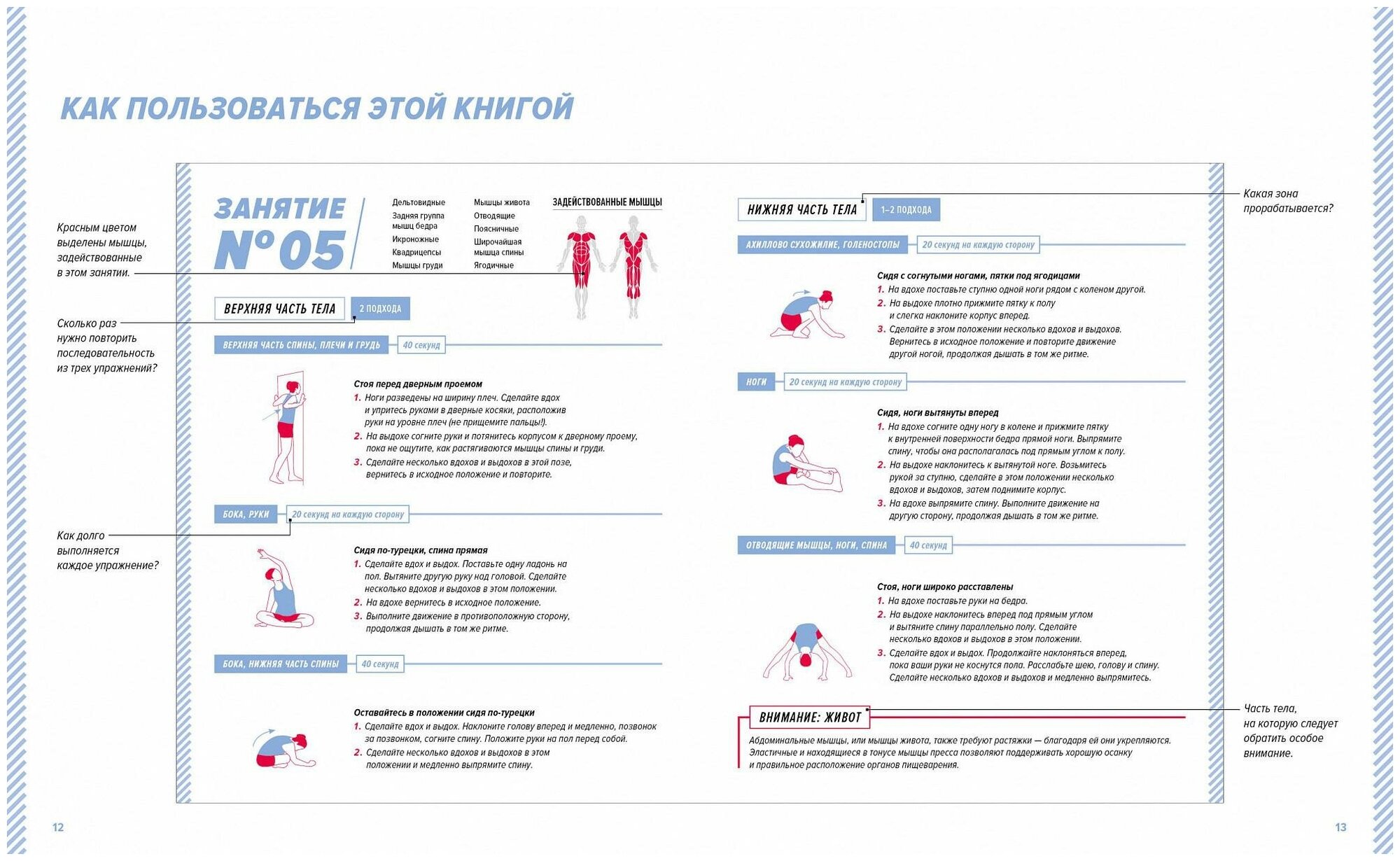 Интересное издание , простыми упражнения для растяжки. Автор уверяет, что этого достаточно для ежедневного стретчинга. Хотя, я думаю, что 7 минут в день все же маловато. Вв целом упражнения полезные. На каждой странице картинка самого упражнения, показано, какие мышцы задействуются(растягиваются), техника выполнения полностью расписана. Так же лаются советы что делать до и после тренировки.
