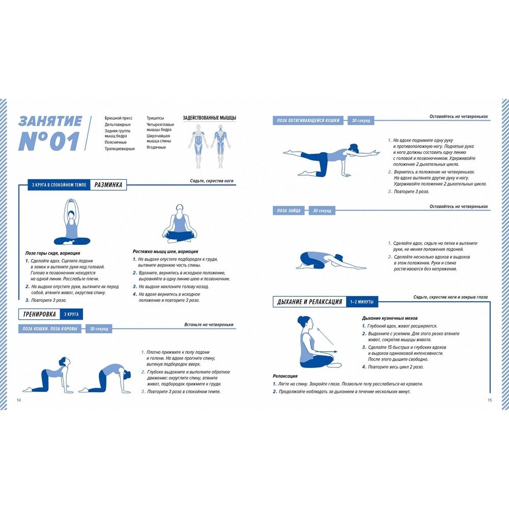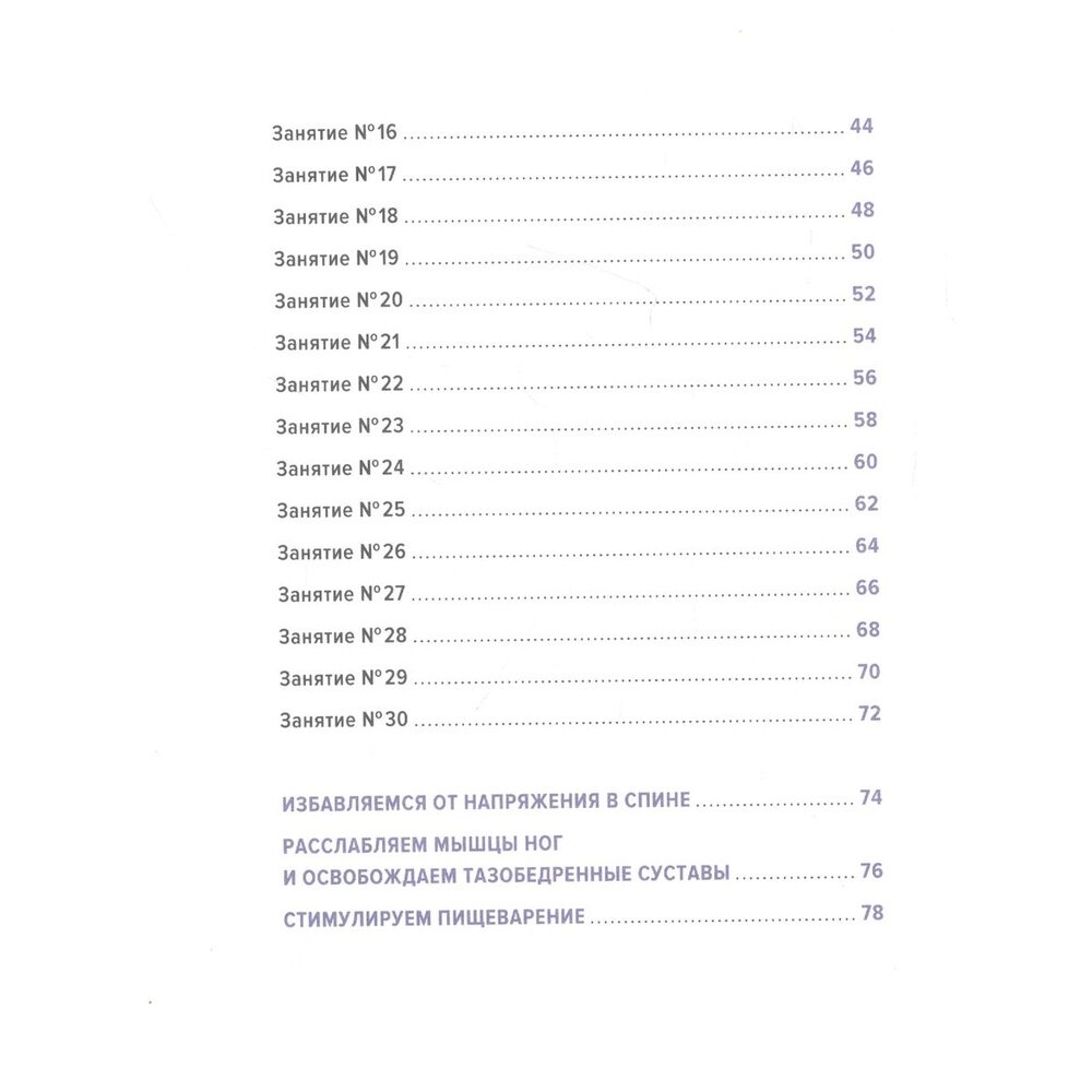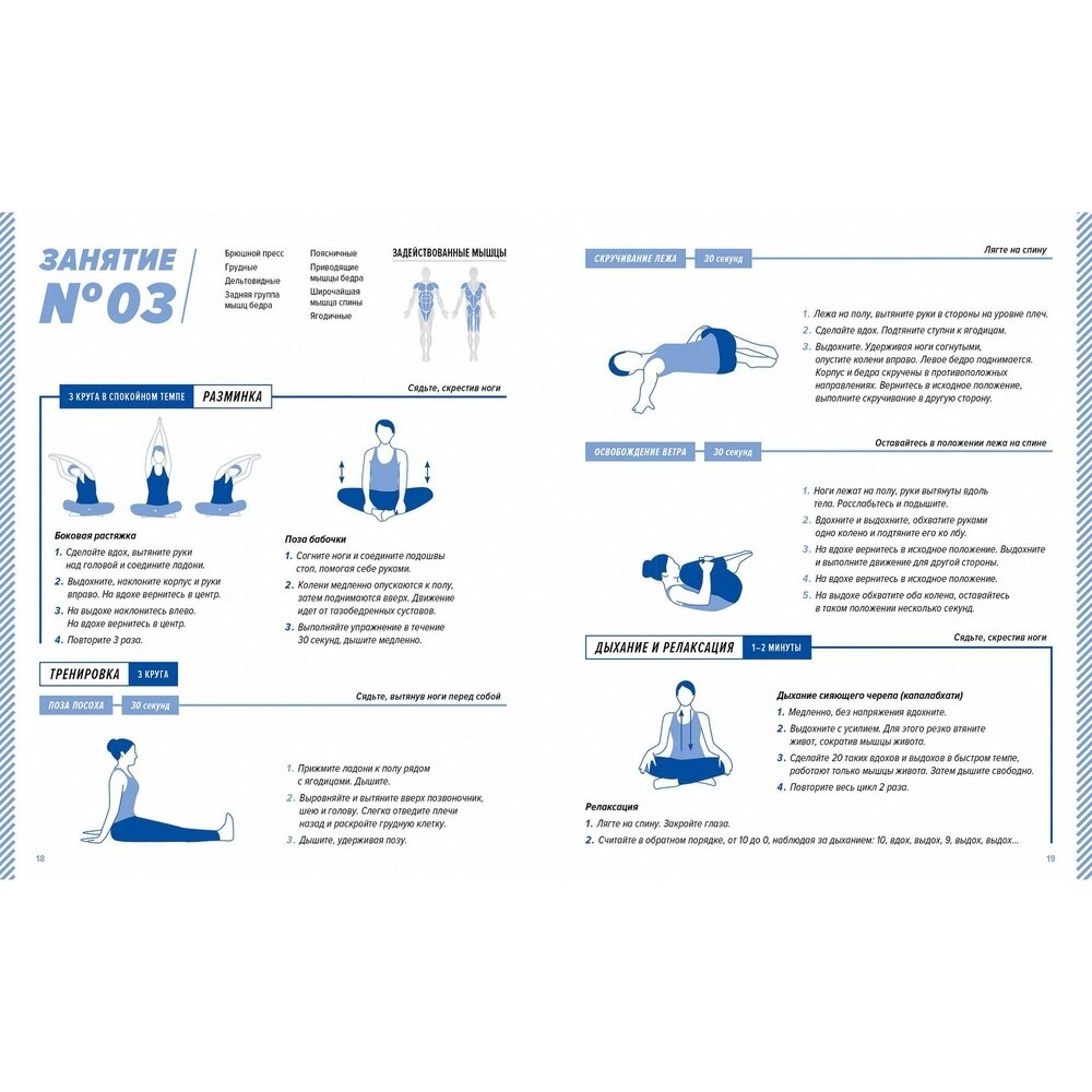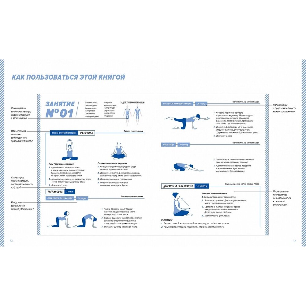 В книге автор дает программу на каждый день , в течении месяца заниматься по ней. Здесь представлена не динамичная йога, а, наоборот, расслабляющая. Асан на каждый день не много, 5-6, как раз достаточно для 7 минут, разминка идет обязательно. Картинка на каждом развороте, указано, какие мышцы задействуются в упражнении, расписана техника выполнения, вопросов не останется. В конце представлены три последовательности асан для пищеварения , тазобедренных суставов и снятия напряжения в спине.