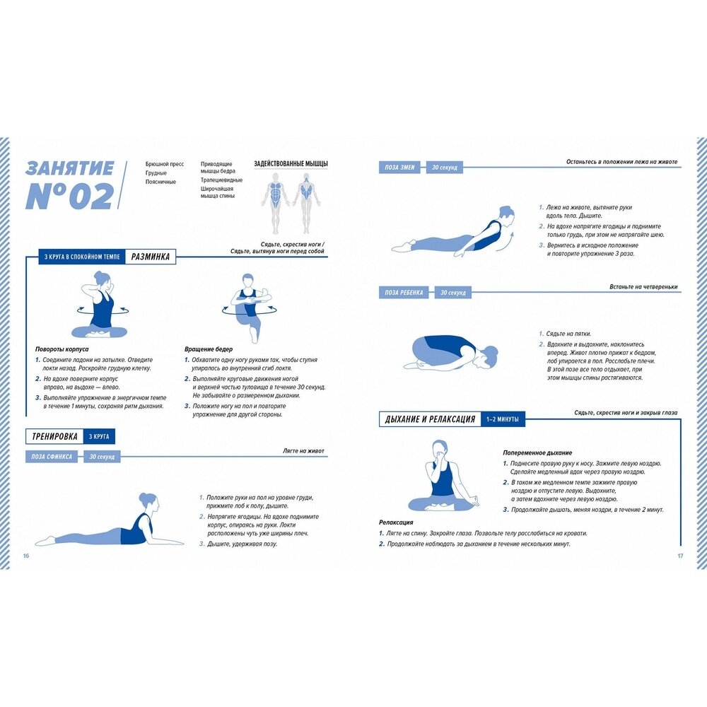 30 занятий, рассчитанных на 1 месяц тренировок. Более чем понятные схемы. Каждое упражнение имеет пошаговую инструкцию выполнения.