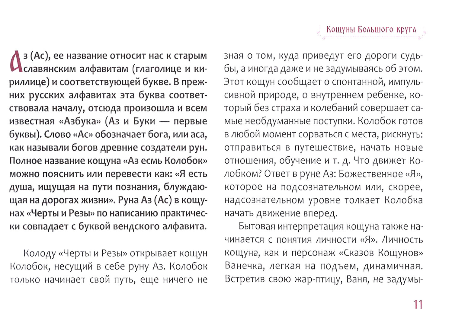 Карты систематизированы по аналогии с традиционным Таро. В колоду входит 22 кощуна Великого круга и 56 кощунов Малого круга. Великий круг несет знания и мудрость волхвов - жрецов славян, а Малый круг - житейский и магический опыт предков. Благодаря такой адаптации кощуны могут "говорить" со всеми, кто хочет получить ответ на свой вопрос, совет или поддержку - независимо от возраста, национальности, образа жизни. Колода прекрасно подходит и для духовной практики, она понравится тем, кто исследует мир и свое место в нем на сакральном, глубинном уровне.
