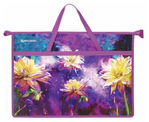 Папка BRAUBERG предназначена для хранения чертежей, рисунков и других художественных изображений. Выполнена из пластика, по краям имеет тканевую окантовку. Одно отделение. Застежка-молния расположена по верхнему краю папки. Цветная печать.