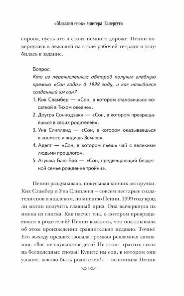 Здесь многое как в дневном мире, но еще больше всего, непохожего на него. Вы сможете убедиться в этом вместе с юной продавщицей лучшего городского магазина снов Пенни. Южнокорейская писательница Ли Мие рассказала обманчиво простую историю о самоотверженной любви родителей, готовых на все, чтобы детям досталась лучшая доля,чем их собственная. О том, сколь многих простых вещей, которые ничего не стоили бы нам, мы не говорим и не делаем для близких людей до того, как станет слишком поздно. О полетах во сне и наяву. Да о том, что если хочешь добиться успеха, необходимо высыпаться - в конце-то концов.