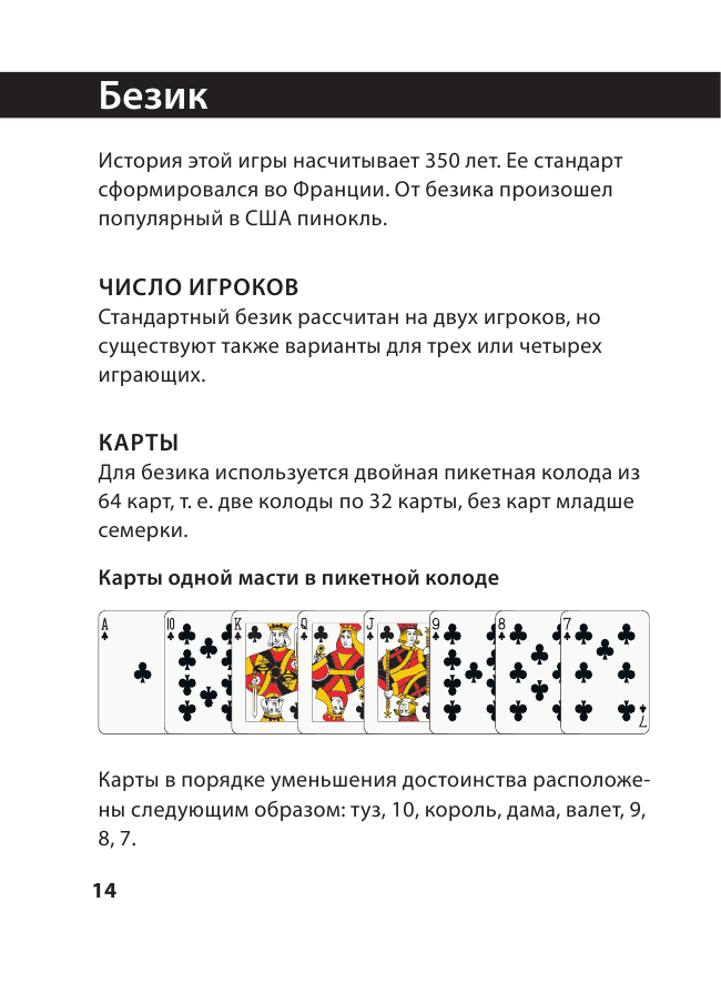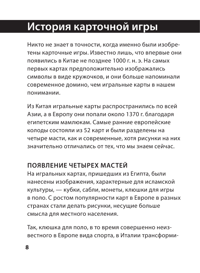 Замечательное издание. Во-первых, удобный формат, справочник компактный, обложка твердая, листы плотные, картинки внутри яркие и четкие, сразу видно качество печати. Во-вторых, содержание, всё что я искала нашла именно здесь. О карточных играх, правила, ход игры, подготовка, цель игры, сколько игроков, стратегии при игре, подсчет очков, очень подробно, а самое главное, что игры действительно разнообразные и однотипных нет, например, есть на набор максимального количества очков, есть на скорость, есть на выбывание, на сбор определенной комбинации карт, на умение хитро подложить карту и т.д. В дорогу или на дачу, или даже на мероприятие типа праздника или посиделок с друзьями самое то, развлечение для гостей обеспечены. Однозначно рекомендую, так как подробнее пособия пока не встречала.